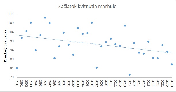 Obr. 7: Priemerný nástup začiatku kvitnutia marhule v rokoch 1990-2023.