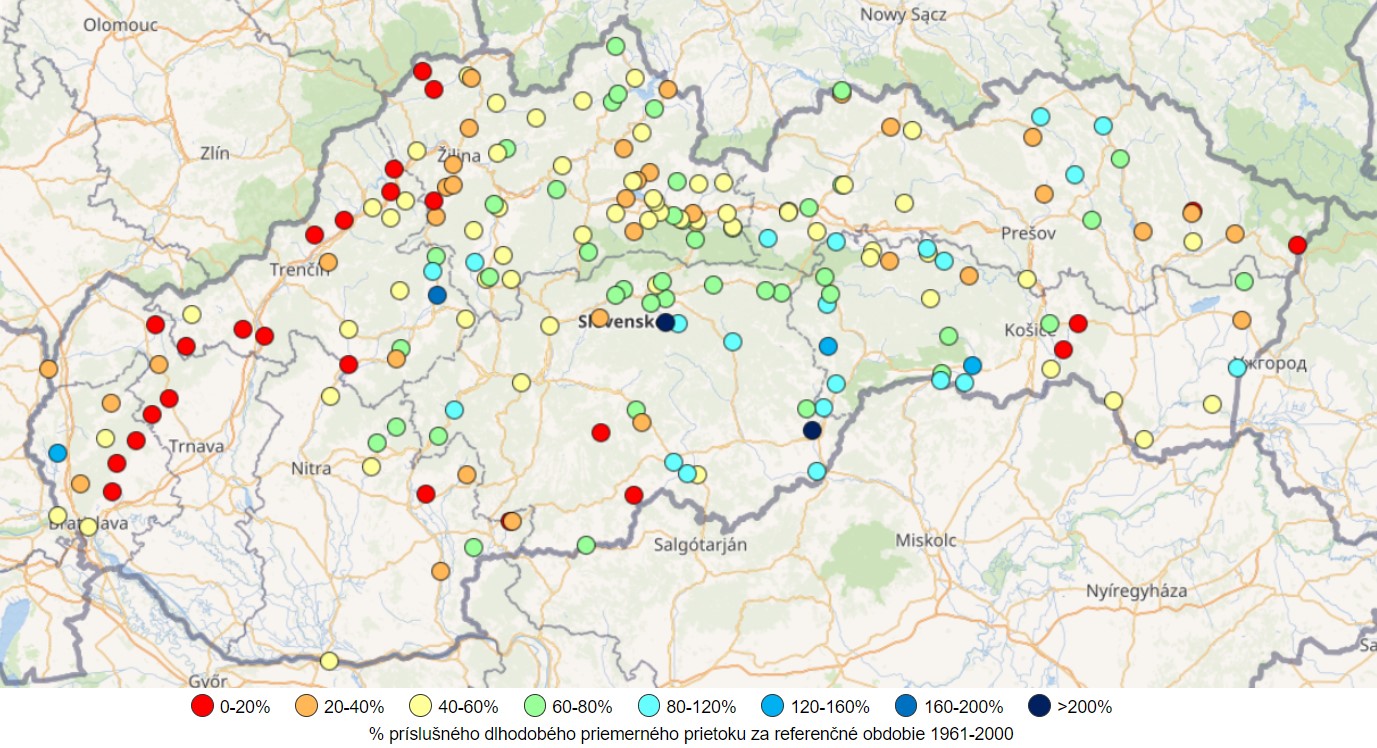 Vplyvom nižších úhrnov zrážok a vyššej priemernej mesačnej teploty na západe Slovenska, sa situácia z hľadiska vodnosti v oblasti malých Karpát počas mesiaca už výrazne nemenila. Hodnoty priemerných denných prietokov dosahovali hodnoty kategórie M-dennosti Q355-364d a nižšie ako Q364d. Na ostatnom území Slovenska boli dosiahnuté hodnoty kategórie Q270-330d až Q180-270d. V povodiach Slanej a Popradu boli dosiahnuté hodnoty kategórie Q90-180d, ojedinele Q30-90d. (Obr. 3).