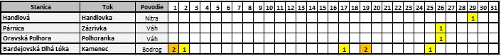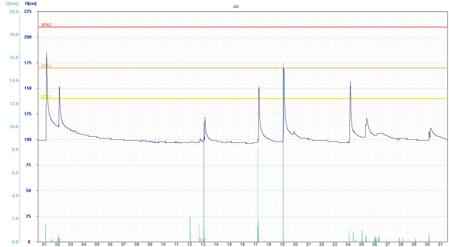 Úvodné dni júla boli charakteristické lokálnymi konvektívnymi zrážkami s priestorovo rozdielnymi úhrnmi zrážok. V povodí hornej Tople sme ojedinele zaznamenali silné búrky s prívalovými zrážkami (denný úhrn zrážok v Regetovke k 2.7. o 6:00 LSEČ bol 82,3 mm). Z tohto dôvodu boli dosiahnuté 1. a prechodne aj 2. stupeň povodňovej aktivity (ďalej len SPA) v Bardejovskej Dlhej Lúke na Kamenci s kulmináciou na úrovni 1- až 2-ročného prietoku (Tab. 1). Podobný charakter zrážok pretrvával s krátkymi prestávkami až do polovice júla, pričom pri lokálnych prívalových lejakoch počas búrok sa vyskytovali len sprievodné javy mimo monitorovaných tokov (boli vyhlásené SPA len na úrovni samospráv).