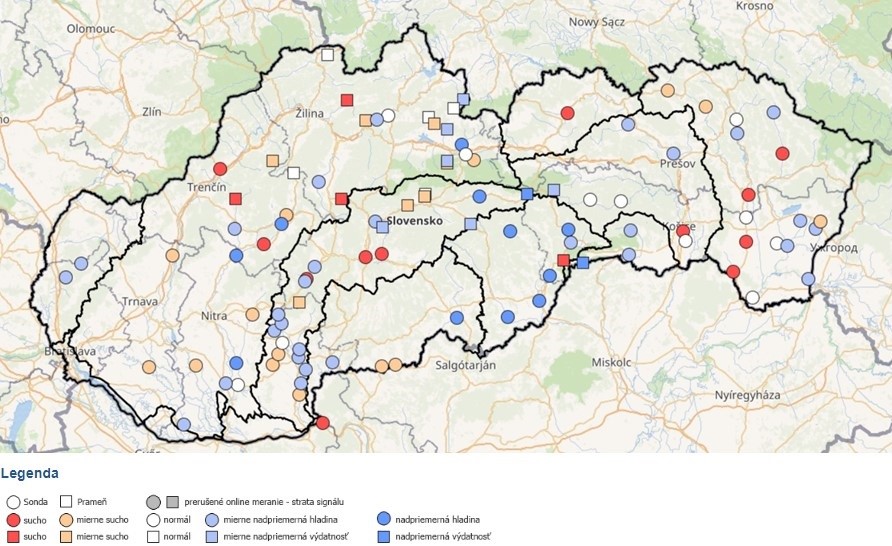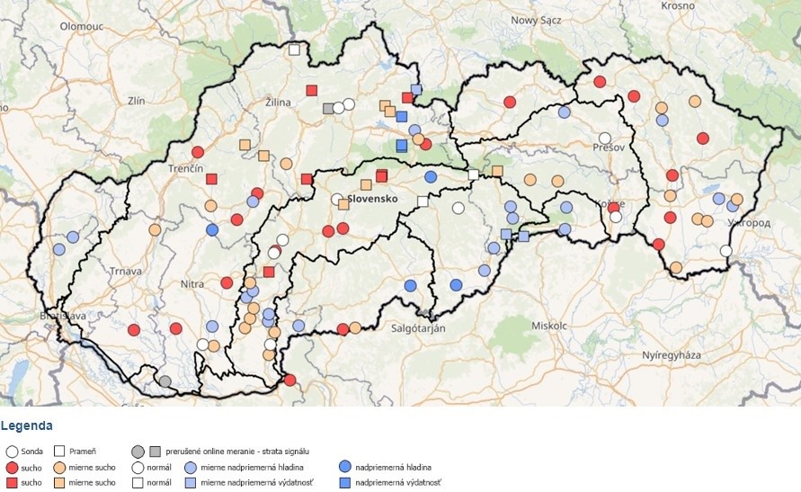 Mierne nadpriemerná a nadpriemerná hladina podzemnej vody a výdatnosť prameňov, ktorým zodpovedajú hodnoty rovné a vyššie ako je ich Q90 (1981-2010) (modrá farba) prevládali v mesiaci júl takmer na celom území Slovenska, okrem severu východného Slovenska. Hladina podzemnej vody a výdatnosť prameňov zodpovedajúce hodnotám Q10 (1981-2010) a nižším ako Q10 (1981-2010) (červená farba) sa vyskytli hlavne v povodí Bodrogu, horného Váhu, Hrona a Popradu (Obr. 6).