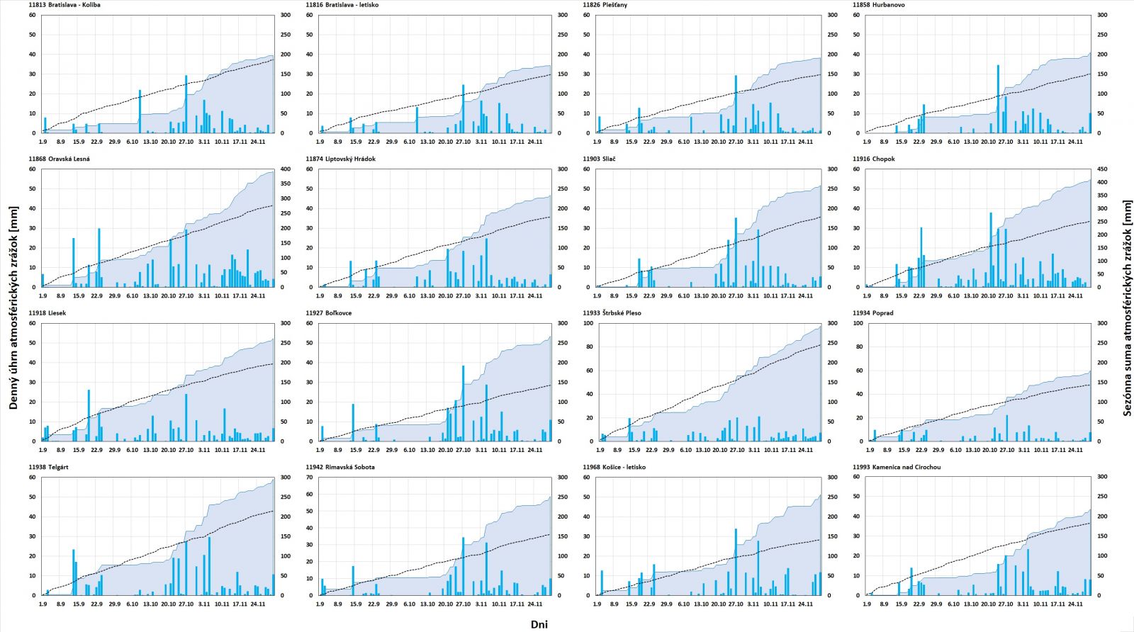 Obr. 3: Denný úhrn atmosférických zrážok [mm] a kumulovaný sezónny úhrn atmosférických zrážok [mm] s vyznačenou priemernou kumulovanou hodnotou atmosférických zrážok [mm] (1991 – 2020) na vybraných meteorologických staniciach na Slovensku v období 1.9. - 30.11.2023 (zdroj: SHMÚ).