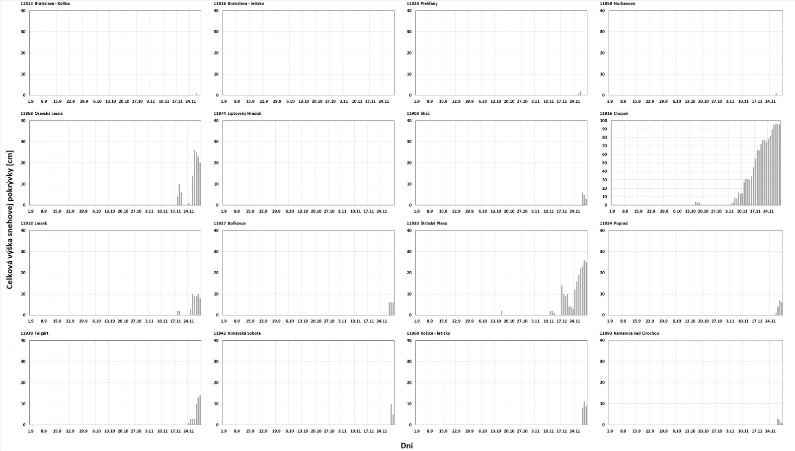 Obr. 5: Denný vývoj celkovej výšky snehovej pokrývky [cm] na vybraných meteorologických staniciach na Slovensku v období 1.9. - 30.11.2023 (zdroj: SHMÚ).