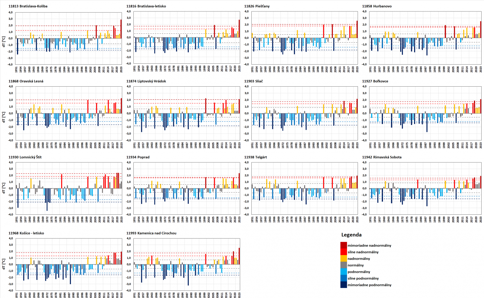 Obr. 2: Odchýlka priemernej sezónnej teploty vzduchu za jeseň [°C] od normálu 1991 - 2020 na vybraných meteorologických staniciach v období rokov 1951 - 2023 (zdroj: SHMÚ).
