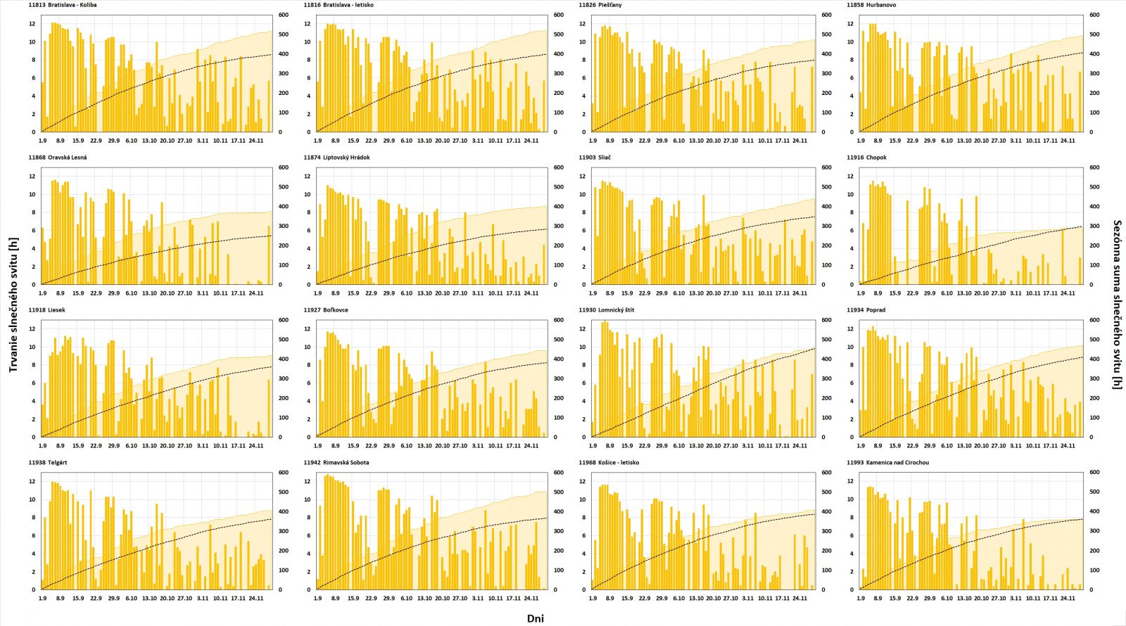 Obr. 6: Denný vývoj slnečného svitu [h] a kumulovaná sezónna suma slnečného svitu [h] s vyznačenou priemernou kumulovanou hodnotou slnečného svitu [h] (1991 – 2020) na vybraných meteorologických staniciach na Slovensku v období 1.9. - 30.11.2023 (zdroj: SHMÚ).