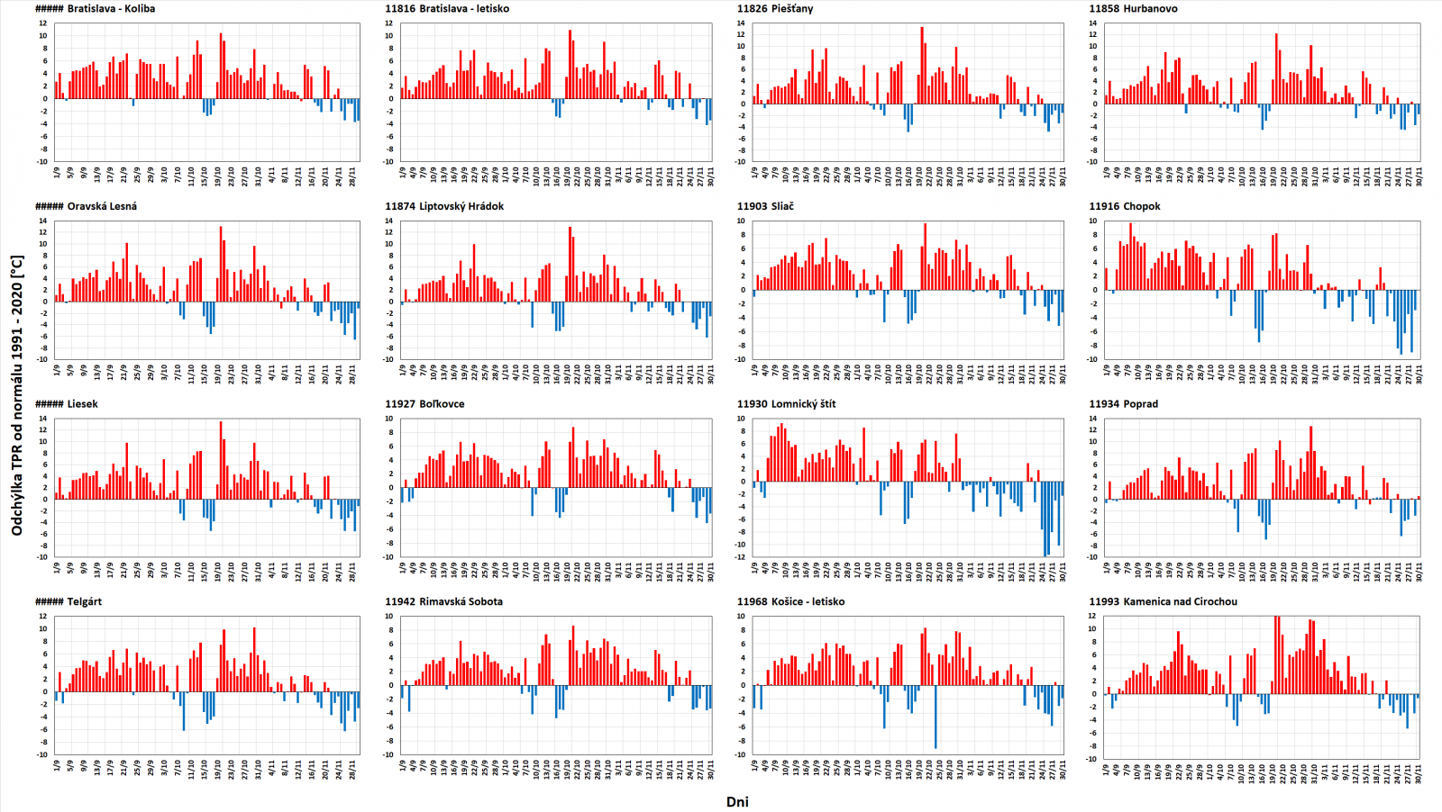 Obr. 1: Vývoj odchýlky priemernej dennej teploty vzduchu [°C] od normálu 1991 - 2020 na vybraných meteorologických staniciach na Slovensku v období 1.9. - 30.11.2023 (zdroj: SHMÚ).