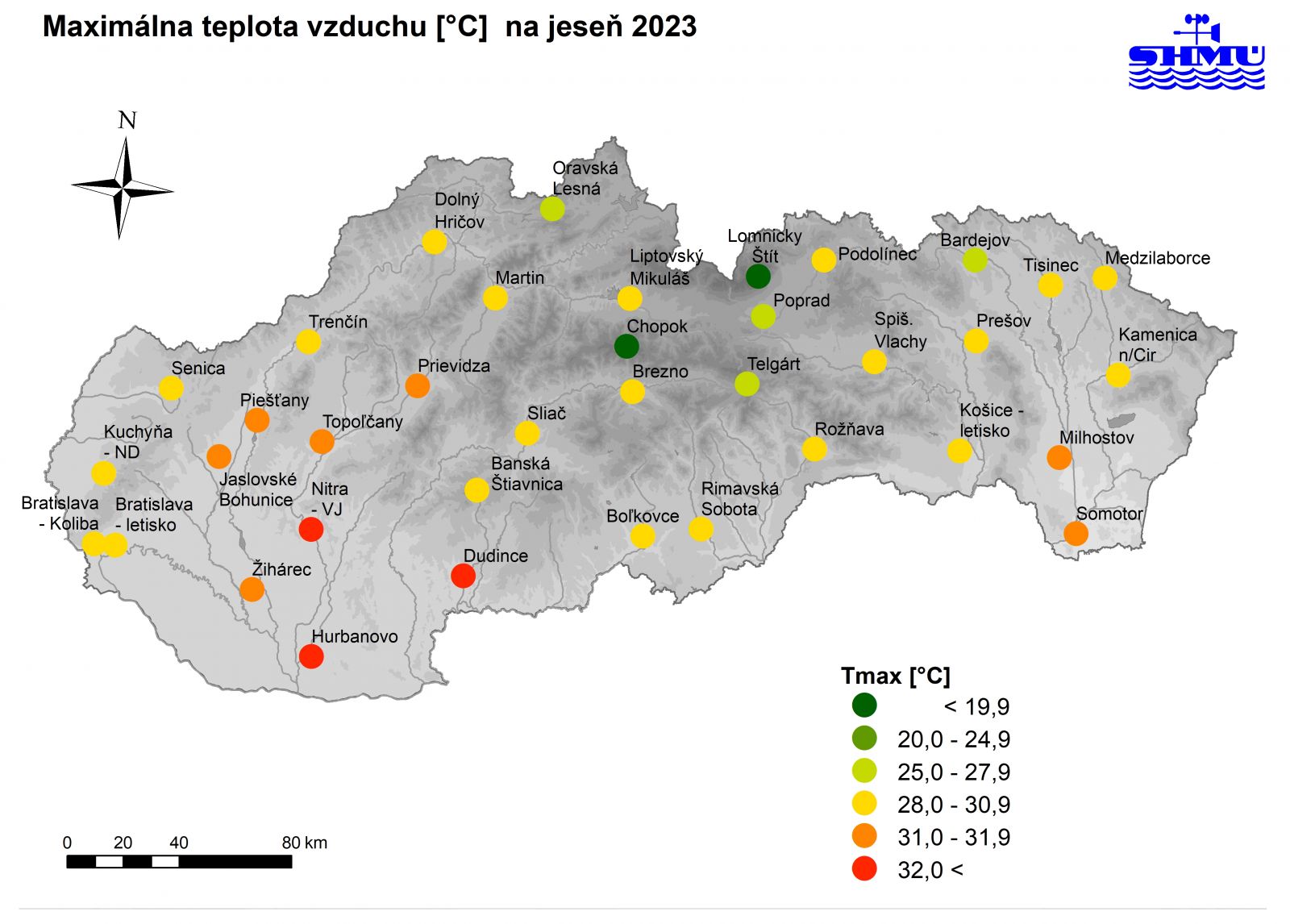 Jeseň, z teplotného hľadiska skončila ako 1. najteplejšia, resp. 93. najchladnejšia aspoň od roku 1931. Štatisticky veľmi významné (sezónne) odchýlky sa vyskytli na celom území Slovenska a tak ju charakterizujeme po teplotnej stránke ako mimoriadne nadnormálnu. Odchýlky od dlhodobého priemeru 1991 – 2020 sa pohybovali 0,8 °C do +4,8 °C, z toho vyplýva, že na celom území Slovenska boli kladné odchýlky. V porovnaní s jednotlivými normálmi (definovaný ako priemer alebo suma za 30 ročné obdobie určitého meteorologického prvku alebo charakteristiky) bola jeseň 2023 o +2,3 °C teplejšia ako hodnota za obdobie 1991 – 2020, resp. o +2,8 °C ako za 1981 – 2010, resp. +3,0 °C ako za 1961 – 1990. Jeseň 2023 bola +0,6 °C teplejšia ako najteplejšia jeseň v r. 2019, resp. +5,2 °C teplejšia ako najchladnejšia jeseň v r. 1931 a to aspoň od r. 1931. Najvyššiu teplotu vzduchu (jeseň) sme zaznamenali vo Vysokej nad Uhom 14,8 °C s odchýlkou +4,8 °C od 1991 – 2020, resp. v Bratislave v Mlynskej doline 14,0 °C s odchýlkou +3,1 °C od 1991 – 2020 (42. najteplejšia jeseň aspoň od roku 1982). Priemerná odchýlka pre územie Slovenska bola +2,1 °C. Jednotlivé mesiace sezóny (jeseň) prispeli do celkového hodnotenia nasledovne.