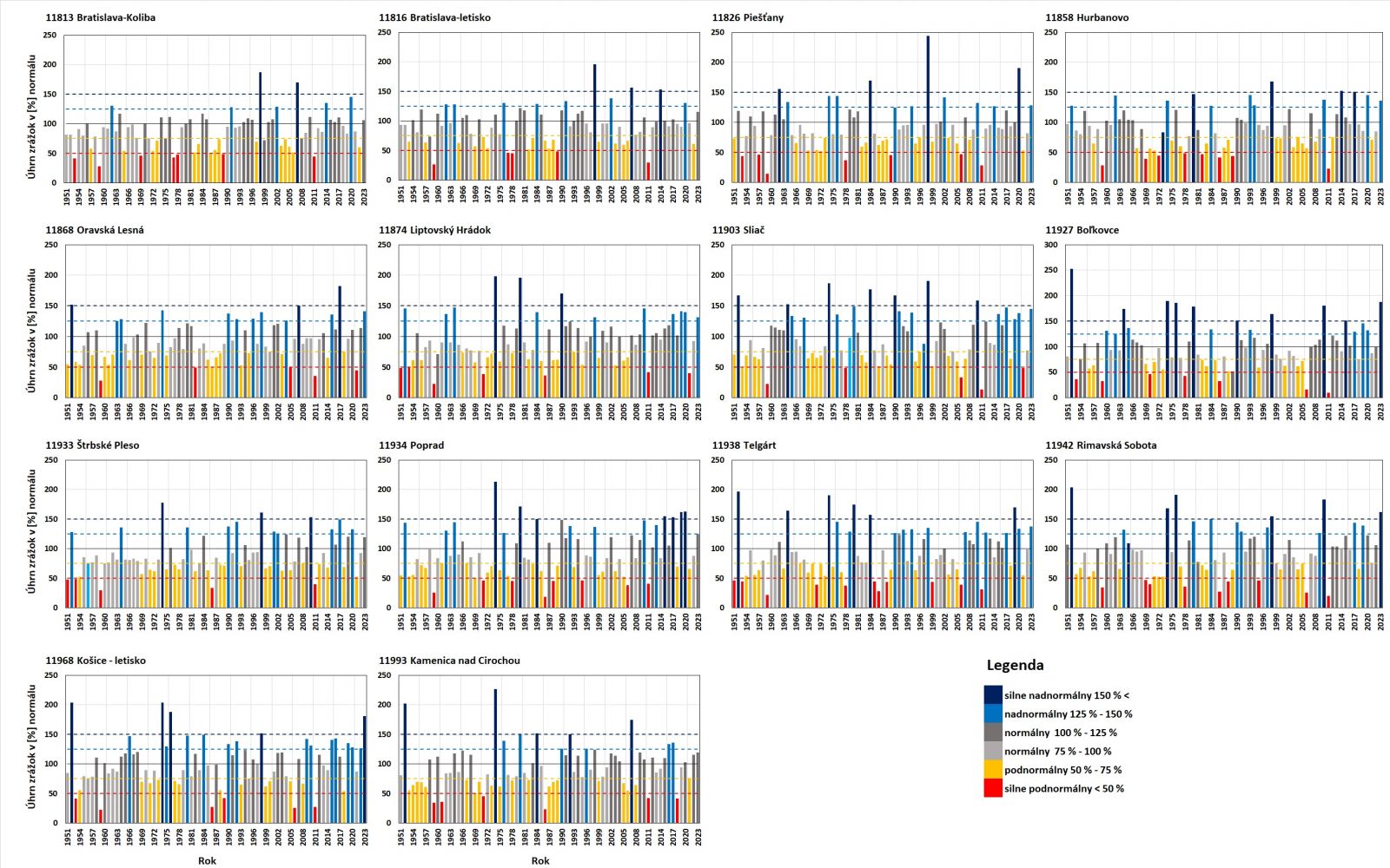 Obr. 4: Odchýlka priemerného mesačného úhrnu atmosférických zrážok [mm] od normálu 1991 - 2020 na vybraných meteorologických staniciach v období rokov 1951 - 2023 (zdroj: SHMÚ).