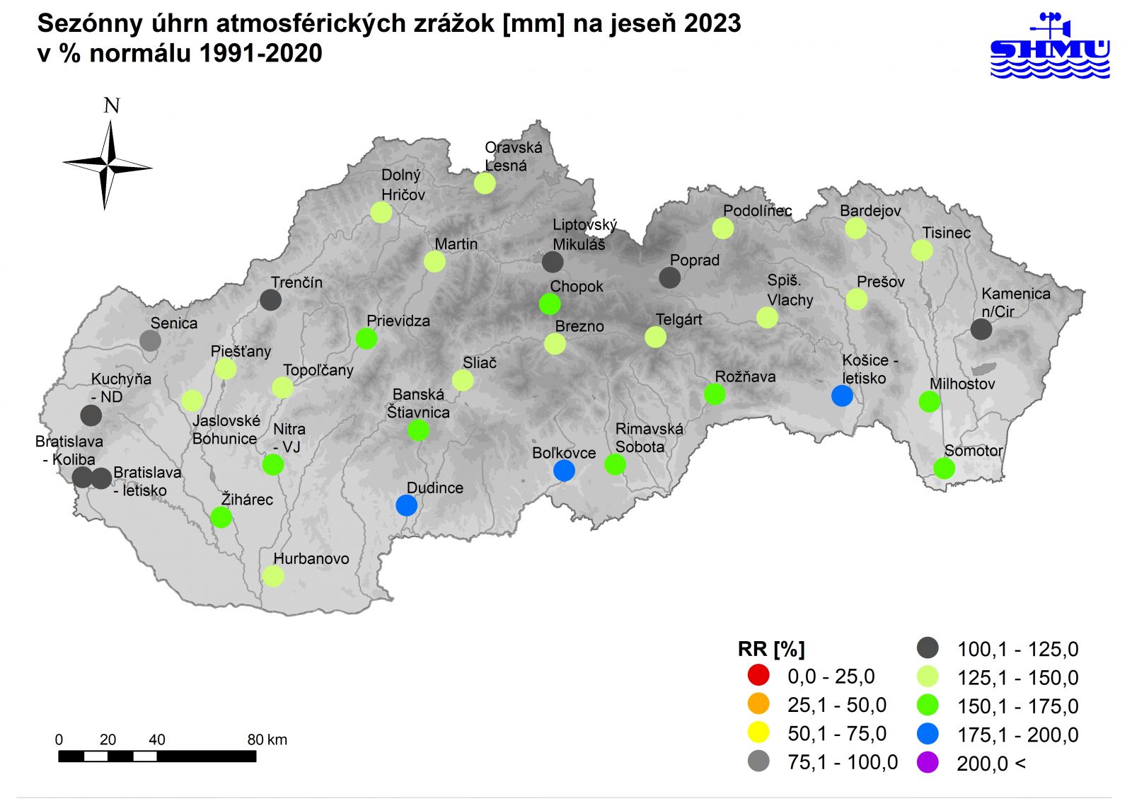November sa tak stal zrážkovo najbohatším mesiacom skončenej jesene. V rozsiahlejších regiónoch Slovenska dosiahli mesačné úhrny zrážok viac ako 100 mm. V najzasiahnutejších oblastiach to bolo až okolo 200 mm (Donovaly 193 mm). Len tam, kde bolo v novembri najmenej zrážok, boli ich mesačné úhrny veľmi podobné ich dlhodobým priemerným hodnotám pre tento posledný jesenný mesiac. Takto to bolo na niektorých miestach na severe Záhoria (Holíč 58 mm, Senica 64 mm a relatívne menej zrážok zaznamenali v novembri niekde aj na Spiši (Gánovce 52 mm, Spišské Vlachy 59 mm). Pretože vlhké vzduchové hmoty viackrát prúdili v tomto mesiaci do priestoru Slovenska od juhu alebo juhozápadu, boli oblasti v južnej polovici Slovenska zasiahnuté výdatnejšími zrážkami viac, ako niektoré oblasti v severnej polovici Slovenska. Takže napríklad na meteorologickej stanici Štós, na južnom svahu Slovenského rudohoria, dosiahol mesačný úhrn zrážok v tohtoročnom novembri 131 mm a v Tatranskej Javorine, na severnom úpätí Tatier, to bolo 122 mm. Výnimočne sa stalo aj to, že mesačný úhrn zrážok v novembri 2023 bol rekordne vysoký. Napríklad v Trebišove zaregistrovali v tohtoročnom novembri 118 mm zrážok a bol to tam najvyšší mesačný úhrn zrážok pre tento mesiac aspoň od roku 1901, čiže za posledných 123 rokov.