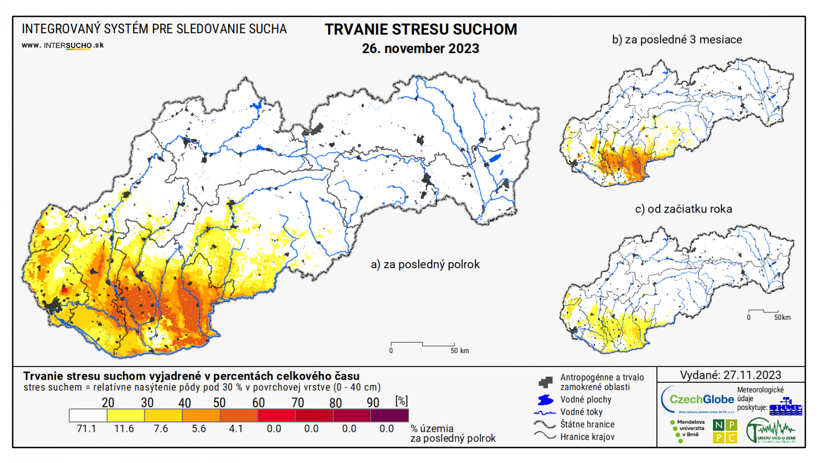 Pôdne sucho – Na začiatku mesiaca september bolo na väčšine územia ešte dostatok vlahy z augustových zrážok. V dôsledku slnečného počasia a vysokého výparu sa v druhej dekáde mesiaca začínajúce až mierne sucho rozšírilo najmä v povrchovej vrstve na strednom Slovensku a krajnom východe. Mierne sucho bolo na Pohroní, Podpoľaní a v Nízkych Tatrách. V poslednej dekáde sa situácia zlepšila a len lokálne sa vyskytovalo začínajúce sucho. Rozsah sucha v októbri 2023 bol najväčší na prelome prvej a druhej októbrovej dekády. Začínajúce sucho bolo na väčšine Banskobystrického kraja, na Podunajskej nížine, Ponitrí a Považí. Na východnom Slovensku bolo začínajúce sucho ojedinele na Hornom Zemplíne. Celkovo bolo začínajúcim suchom zasiahnutých najviac 14 % územia, v povrchovej vrstve to bolo až 1/5 územia. Mierne sucho bolo lokálne v Žiarskej kotline a v okolí Pezinka. V druhej polovici októbra sa vyskytli výrazné zrážky na väčšine územia, a to predovšetkým v Banskobystrickom kraji. Preto sa aj situácia viditeľne zlepšila a na konci októbra sme už sucho nikde nepozorovali. Veľmi priaznivá situácia pokračovala po celý november a sucho nikde nevyskytlo.