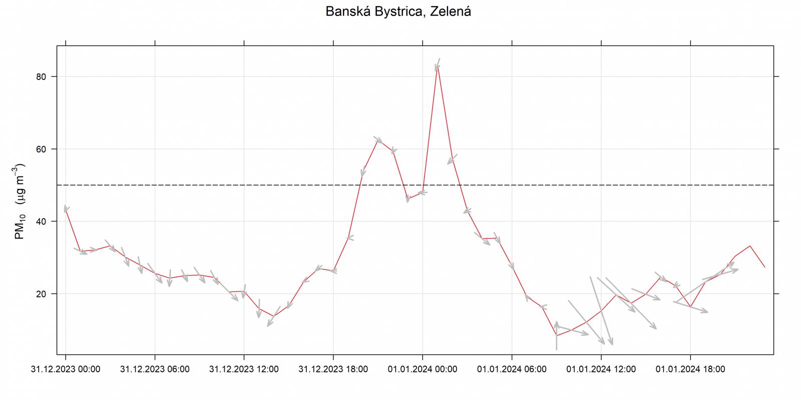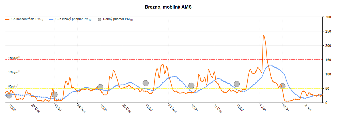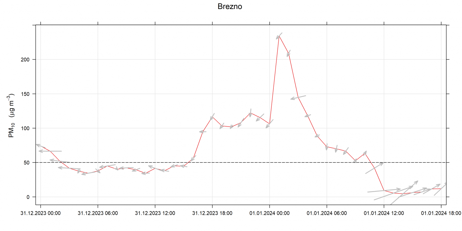 Obr. 2 Maximálne koncentrácie PM10 namerané počas silvestrovskej noci na mobilnej monitorovacej stanici v Brezne.