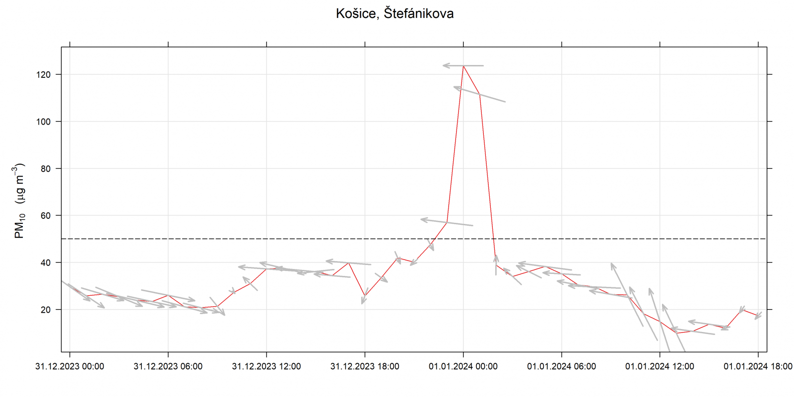 V porovnaní s oslavami na prelome rokov 2022/2023 boli tentoraz maximálne koncentrácie namerané počas silvestrovsko-novoročnej noci nižšie o viac než polovicu (Tab. 1).
