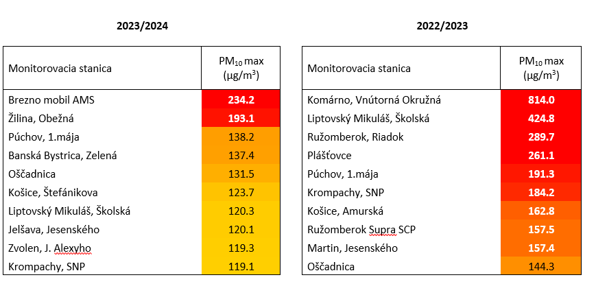 Tab. 1 porovnanie maximálnych koncentrácií PM10 nameraných na monitorovacích staniciach kvality ovzdušia počas Silvestra 2023 a 2022.