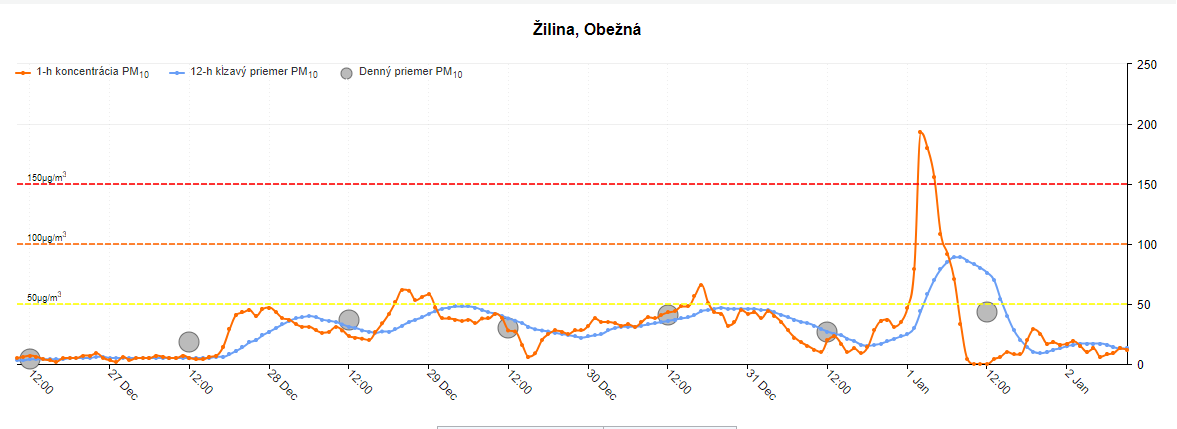 Obr. 3 Maximálne koncentrácie PM10 namerané počas silvestrovskej noci na monitorovacej stanici v Žiline na ulici Obežná.