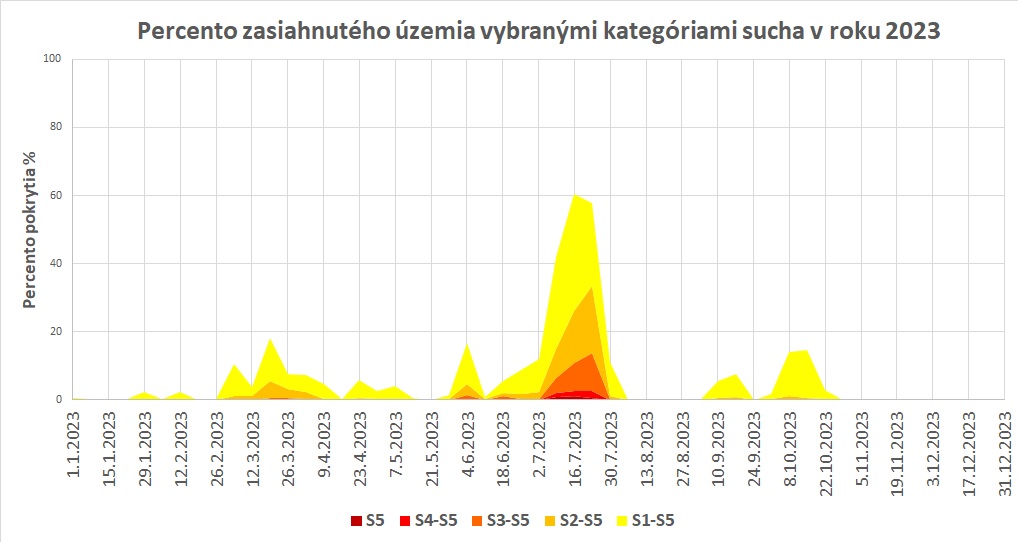 Zimné mesiace priniesli dostatok vlahy na väčšine územia. Sucho sa v zime 2022/23 vyskytlo len koncom zimy v regióne Spiš a na juhovýchodnom Slovensku. Zhoršenie situácie nastalo až v marci. Koncom marca bolo na juhozápadnom a západnom Slovensku lokálne výrazné až výnimočné sucho, pričom v pôdnej vrstve 0-40 cm to predstavovalo spolu 3,6 % celkovej plochy Slovenska. Najnižšie nasýtenie v marci bolo v povrchovej vrstve na krajnom juhozápade v intervale 10-20 %. Mesiac máj bol na viacerých miestach vlhký až veľmi vlhký. Nadbytok vlahy bol do 60 mm na juhozápadnom Slovensku a na severe Slovenska. V letných mesiacoch sa striedali kratšie suché a vlhké obdobia. V lete sucho vrcholilo v druhej polovici júla, kedy bolo výrazné až extrémne sucho na severozápade Slovenska. Extrémne sucho vtedy zasahovalo 1,7 % územia a celkovo bolo suchom rôznej intenzity zasiahnutých až 60 % územia (Obr. 1). Relatívne nasýtenie pokleslo na juhozápadnom a západnom Slovensku pod 10 %. Deficit vlahy bol v júli na severe stredného a západného Slovenska ojedinele -40 až -80 mm. Veľmi vlhké obdobie nastalo na začiatku augusta, keď na takmer celom území bol nadbytok vlahy. V západnej časti východného Slovenska bol nadbytok vlahy v pôdnom profile 0-100 cm až +80 mm. V septembri sa sucho obnovilo na strednom a čiastočne aj na východnom Slovensku. Začínajúce až mierne sucho bolo na približne 7,5 % územia. Na prelome septembra a októbra situácia zlepšila a sucho skončilo. V prvej polovici októbra sa ešte opäť obnovilo začínajúce až mierne sucho najmä v južnej polovici stredného a západného Slovenska, pričom najvyšší deficit vlahy bol na strednom Slovensku a krajnom východe v intervale -40 až -60 mm. Na jeseň bolo najnižšie relatívne nasýtenie 20-30 % miestami na Podunajskej nížine, Záhorí a v južnej časti stredného Slovenska. Od druhej polovici októbra sa situácia zlepšovala a sucho postupne úplne zaniklo. V novembri a decembri bolo veľmi vlhko na väčšine územia a celé územie Slovenska bolo tieto dva mesiaca bez rizika sucha, pričom nasýtenie na konci roka bolo na celom území vyššie ako 90 %.