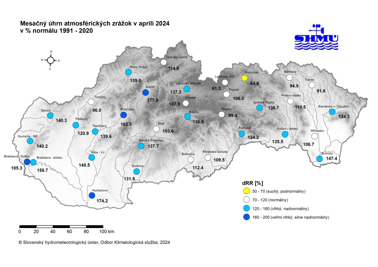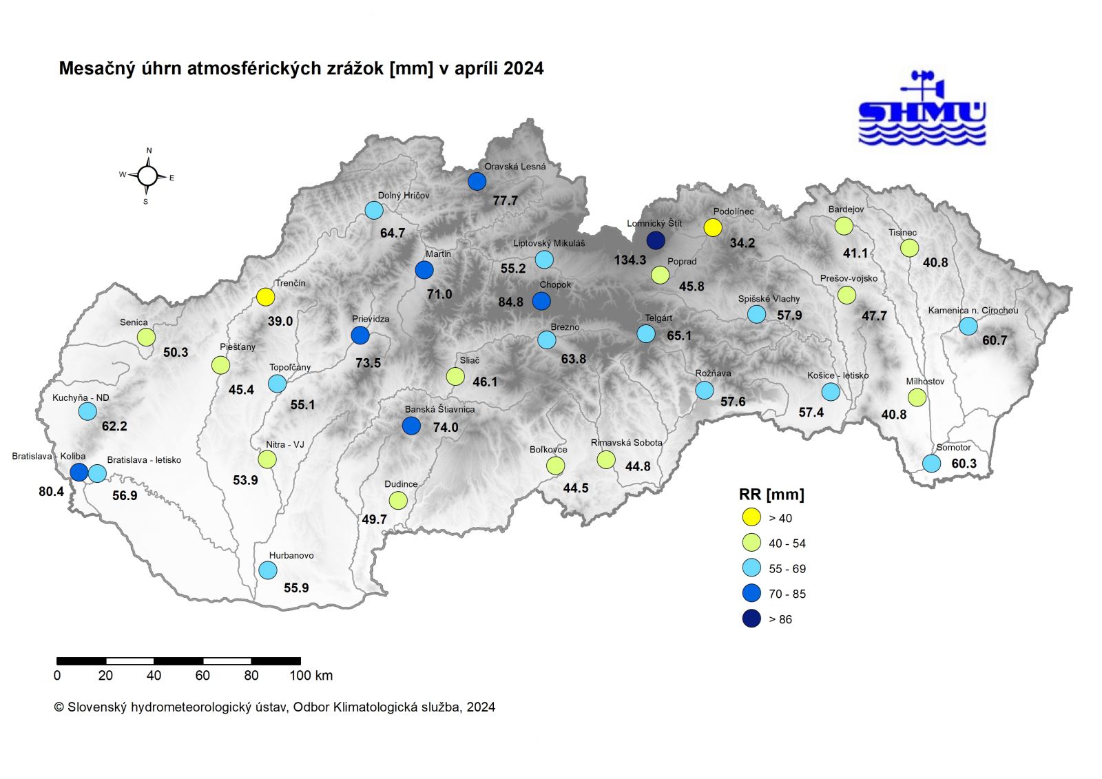 Apríl 2024 bol na väčšine územia Slovenska zrážkovo podnormálny (suchý) až silne nadnormálny (veľmi vlhký). Percento normálu 1991-2020 mesačného úhrnu zrážok bolo najvyššie 185,3 % v Bratislave-Kolibe a najnižšie 64,8 % v Podolínci. Najnižší mesačný úhrn bol 30,0 mm v obci Teplý Vrch. Pod hranicou 40 mm bol mesačný úhrn zrážok aj na staniciach Podolínec a Buzica 34,2 mm, Silica 36,1 mm, Hanušovce n. Topľou 36,6 mm, Čaklov a Brezovica n. Torysou 37,0 mm, Lenartovce 37,5 mm, Turany n. Ondavou 38,1 mm, Tatranská Lomnica 38,8 mm a Trenčín 39,0 mm. Najvyšší mesačný úhrn zrážok bol v obci Kľak 134,0 mm. Nad 100 mm bol mesačný úhrn zrážok aj na staniciach Vrátna dolina 117,1 mm, Martinské hole 116,8 mm, Jasná 116,1 mm a Handlová-Nová Lehota 101,4 mm.