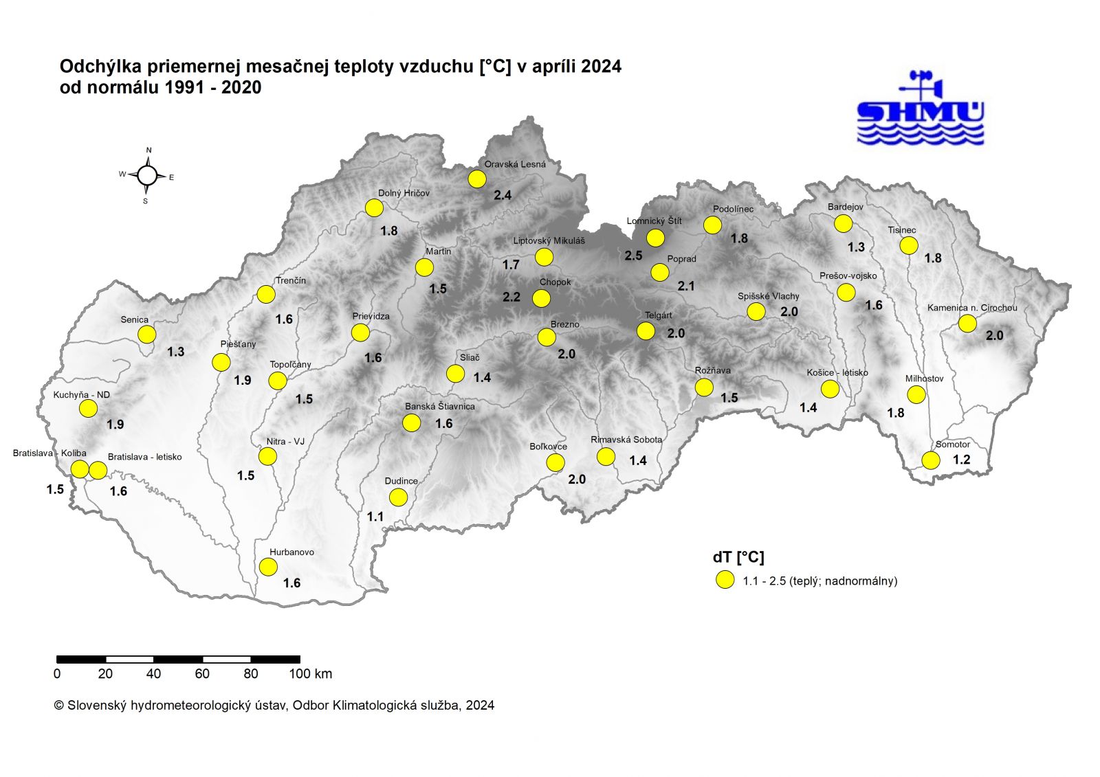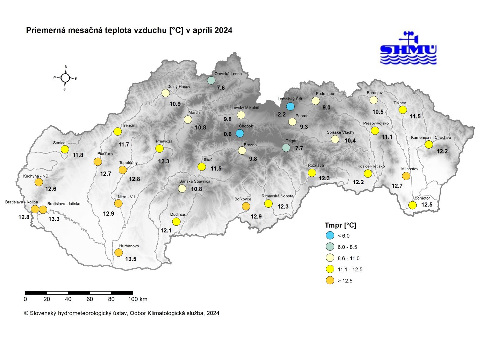 Apríl 2024 skončil na Slovensku po teplotnej stránke ako nadnormálny (teplý). Najvyššia odchýlka priemernej mesačnej teploty vzduchu od normálu 1991–2020 bola 2,4 °C v Oravskej Lesnej (na Lomnickom štíte to bolo až 2,5 °C). Najnižšia odchýlka teploty vzduchu bola 1,1 °C v Dudinciach. Najvyššia priemerná mesačná teplota vzduchu bola 13,5 °C v Hurbanove. Najnižšia priemerná mesačná teplota vzduchu bola 7,2 °C v obci Stratená. Absolútne najnižšia teplota vzduchu do 1000 m n. m. bola nameraná 19.4. v obci Čierny Balog -5,7 °C (na Lomnickom štíte to bolo -14,9 °C). Absolútne najvyššia teplota vzduchu bola 29,6 °C, nameraná dňa 14.4. v Hurbanove. Nad 29 °C bolo aj v Žihárci, a to 29,1°C.