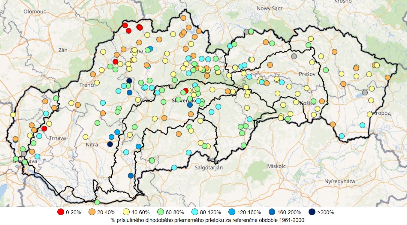 Hodnoty priemerných mesačných prietokov (Qm) v sledovaných vodomerných staniciach (VS) boli veľmi variabilné vo všetkých povodiach na celom území Slovenska. Vo VS v povodiach Moravy a Váhu prevládali hodnoty mesačných prietokov spadajúce do kategórie suchý až výrazne podnormálny mesiac (20 - 60 % Qma,1961-2000). Väčšina hodnôt mesačných prietokov vo VS v povodiach Hornád, Bodva a Bodrog spadali do kategórie výrazne podnormálny mesiac (40 - 60 % Qma,1961-2000), v povodiach Hron, Ipeľ, Slaná a Dunajec a Poprad do kategórie podnormálny mesiac (60 - 80 % Qma,1961-2000). Miestami, v povodiach stredného Slovenska, boli dosiahnuté hodnoty mesačných prietokov vo VS kategórie normálne vodný mesiac (80 - 120 % Qma,1961-2000, Obr. 1).