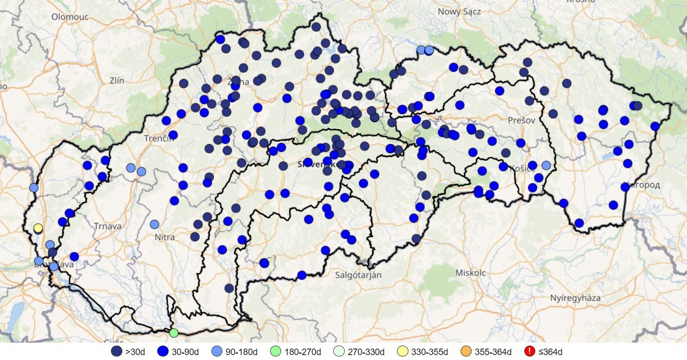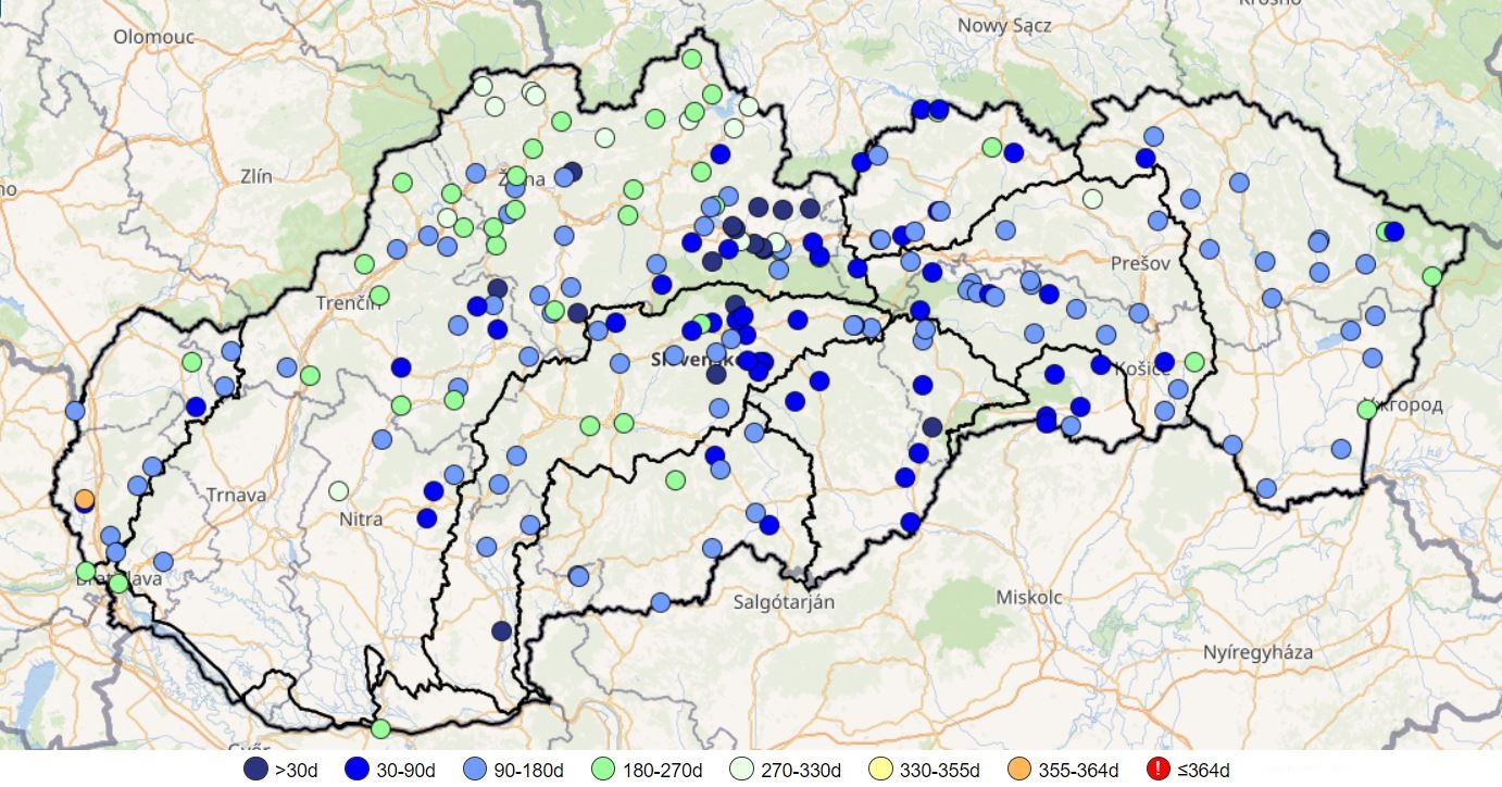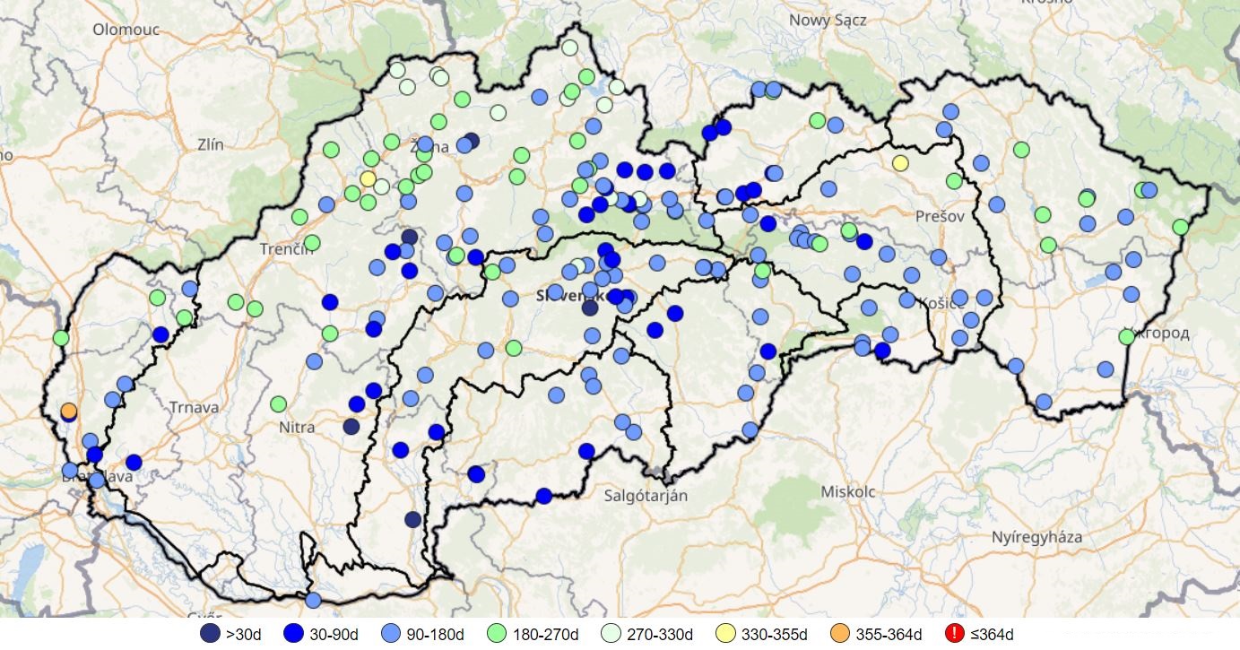 V závere mesiaca prietoky v sledovaných VS dosahovali hodnoty kategórie M-dennosti Q90-180d vo väčšine VS v povodí Slovenska, hodnoty Qd väčšie ako 30-denný prietok boli dosiahnuté vo VS v povodí Hrona a Nitry. Hodnoty Qd odpovedajúce hodnotám kategórií Q180-2700d a Q270-330d naďalej pretrvávali v sledovaných VS v povodí Váhu, ďalej v povodí Hornádu a Bodrogu, miestami aj v povodí Moravy a horného Hrona (Obr. 4).
