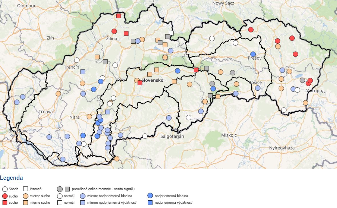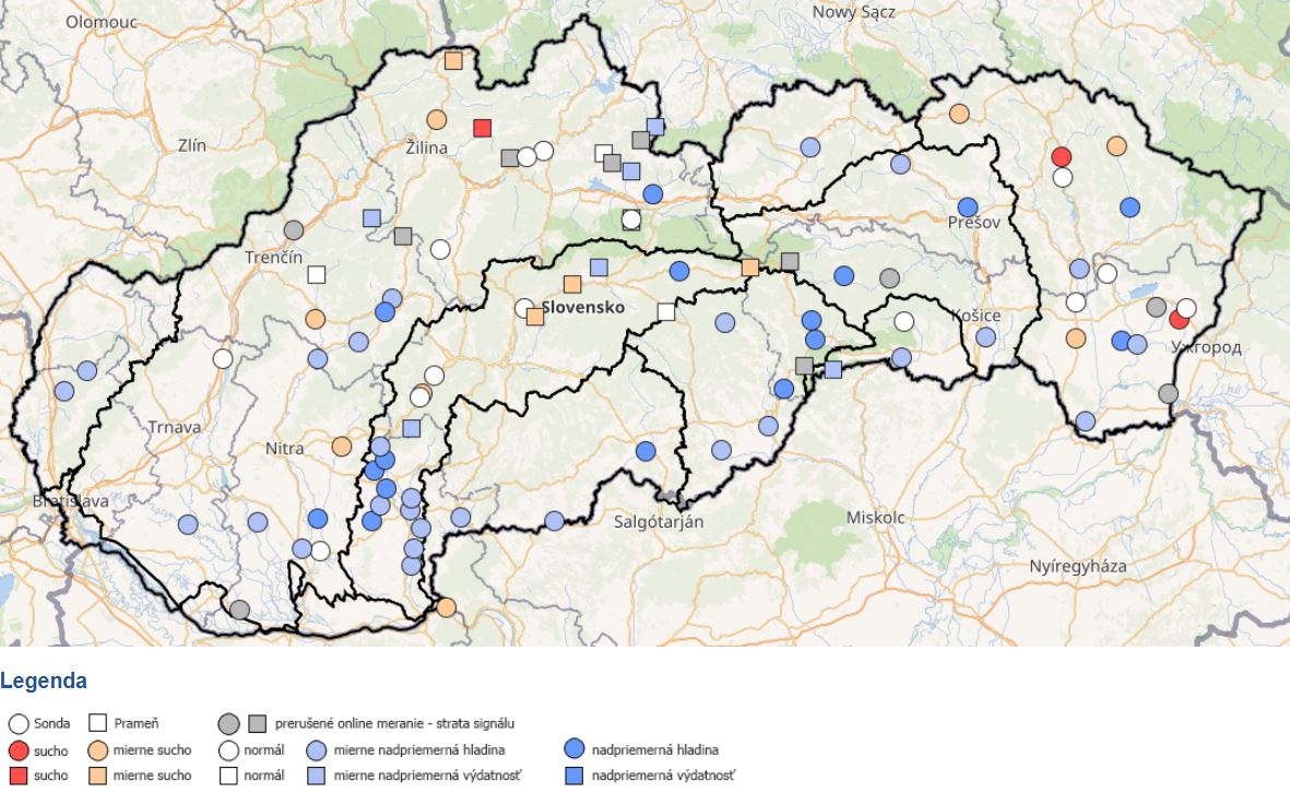 Začiatkom mesiaca (Obr. 6) a aj počas prvej dekády prevládali na väčšine územia mierne nadpriemerné a nadpriemerné hodnoty hladiny podzemnej vody a výdatnosti prameňov. Výnimkou bolo povodie Kysuce a severná časť povodia Bodrogu, kde sa vyskytovali hodnoty nižšie (Q40) a výrazne nižšie (Q10) ako je ich dlhodobý normál referenčného obdobia 1981-2010 a vykazovali tak mierne sucho až sucho.