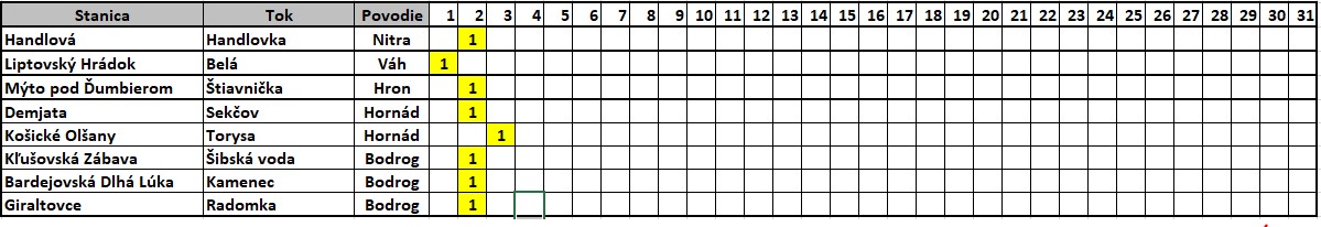Vzostup až výrazný vzostup vodných hladín z trvalejších zrážok, v horských oblastiach aj z topiaceho sa snehu, sme zaznamenali vo väčšine povodí, bol však len krátkodobého charakteru s nevýznamnými N-ročnými prietokmi. Ku krátkodobému prekročeniu 1. SPA došlo na vodomerných staniciach len ojedinele (Tab. 1).