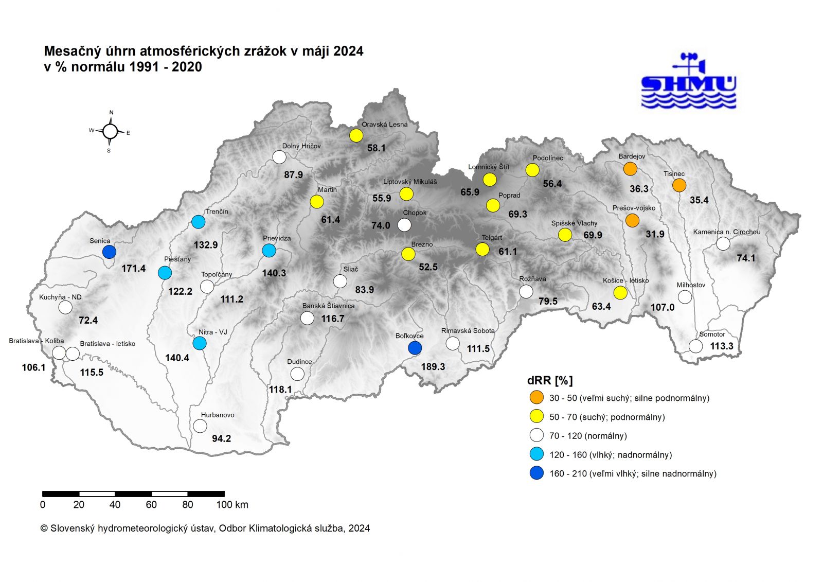 Máj 2024 bol na väčšine územia Slovenska zrážkovo silne podnormálny (veľmi suchý) až silne nadnormálny (veľmi vlhký). Percento normálu 1991 - 2020 mesačného úhrnu zrážok bolo najvyššie 189,3 % v Boľkovciach a najnižšie 31,9 % v Prešove-vojsku. Najnižší mesačný úhrn bol 22,4 mm v obci Nižná Polianka. Pod hranicou 30 mm bol mesačný úhrn zrážok aj na staniciach Prešov-vojsko 26,4 mm, Cigeľka 26,7 mm, Kapušany 26,8 mm, Tisinec 28,1 mm a Bardejov 28,7 mm. Najvyšší mesačný úhrn zrážok bol v obci Kľak 206,6 mm. Vysoký mesačný úhrn zrážok aj na staniciach Jarabá 144,5 mm, Málinec 140,5 mm, Štrbské Pleso 136,3 mm, Boľkovce 132,1 mm, Čierny Váh 130,3 mm, Budiná 128,9 mm, Motešice 128,4 mm a Mlynky 121,2 mm, Banská Bystrica 119,1 mm, Donovaly 116,3 mm, Skalnaté Pleso 115,3 mm, Modra-Piesok 111,6 mm, Žiar nad Hronom 111,1 mm, Ratková 108,8, Podbanské 107,7 mm a Senica 106,6 mm.
