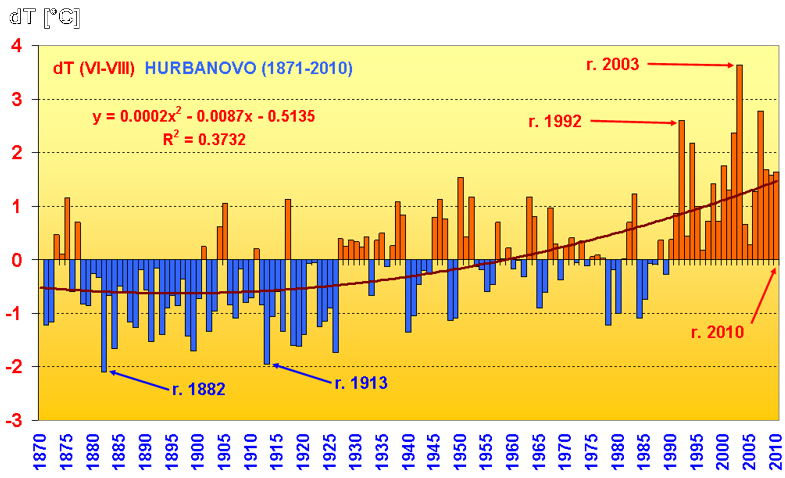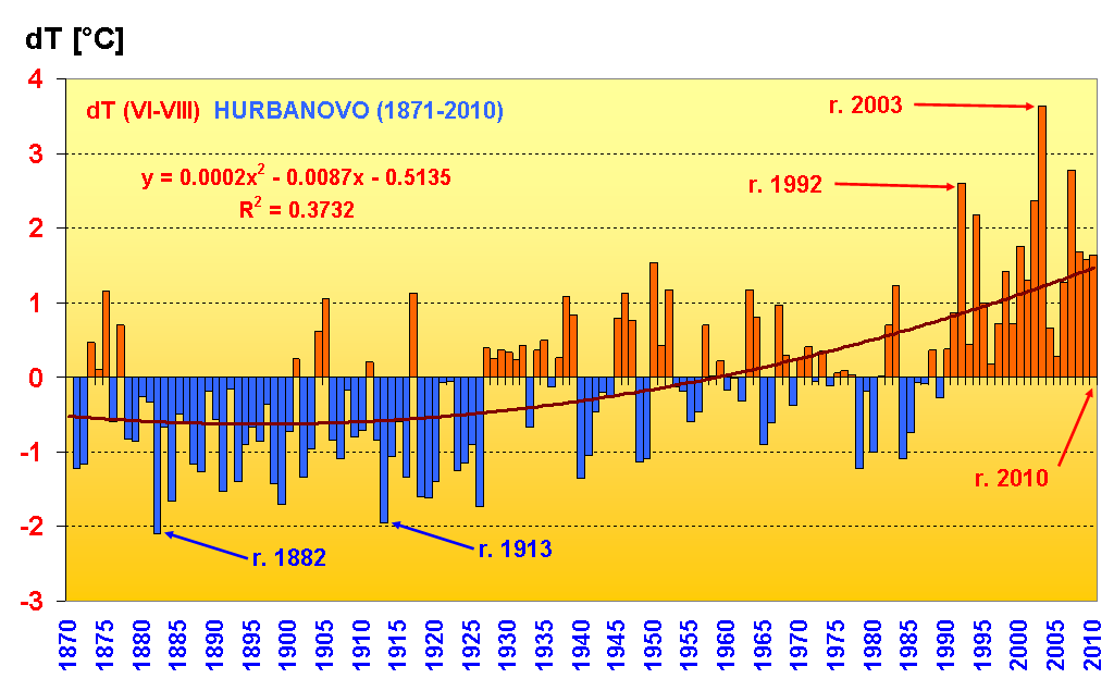 Obr. 7 Odchýlky priemernej letnej teploty vzduchu v Hurbanove od normálu 1961-1990 v období rokov 1871-2010; plná čiara predstavuje polynomický trend 2. stupňa (Zdroj: SHMÚ)