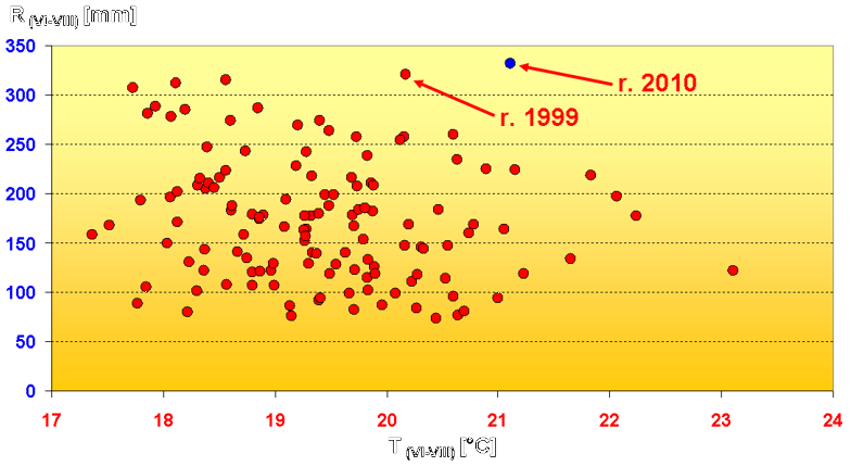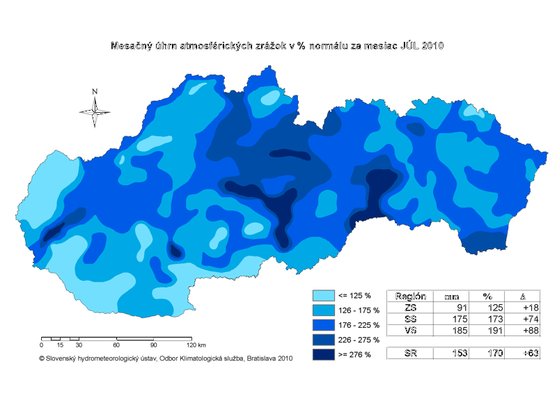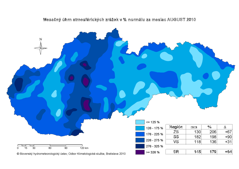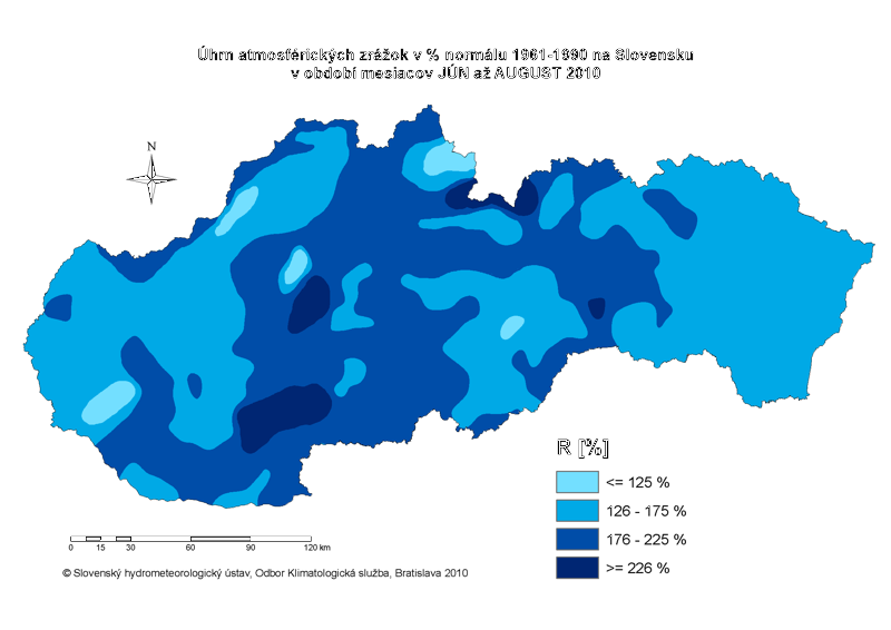 Veľmi zaujímavú analýzu prináša mapa na Obr. 9, kde je znázornená priestorová distribúcia zrážok za obdobie od januára do konca augusta 2010, vyjadrených v percentách ročného úhrnu vypočítaného za obdobie 1961-1990. Uvedená analýza jednoznačne potvrdzuje bezprecedentnosť tohtoročných zrážok, ktoré zatiaľ smerujú k rekordne najvyšším v celej histórii meteorologických meraní na Slovensku. Možno to doložiť aj tým, že na celom území Slovenska do konca augusta spadol už minimálne ročný úhrn. Ako však vidieť na Obr. 9 prevažná väčšina južnej polovice Slovenska, Slovenského rudohoria, Tatier a Zamaguria smeruje k prekročeniu, prípadne už prekročila dvojnásobok ročného úhrnu. Mimoriadne je aj to, že na viac ako 10% staníc dosiahol už koncom augusta kumulatívny úhrn zrážok aspoň 1000 mm (najviac v regióne Vysokých Tatier a Zamaguria; Lomnický štít – 1910 mm, Javorina – 1629 mm; Skalnaté Pleso – 1547 mm alebo Podspády – 1512 mm). Za povšimnutie stojí aj zistenie, že zrážky počas celého leta vypadávali pri priemernej vyššej teplote vzduchu (Obr. 10) ako pri podobne daždivých letách (ako napríklad leto v roku 1965).