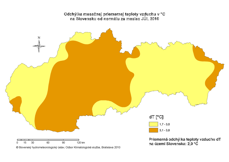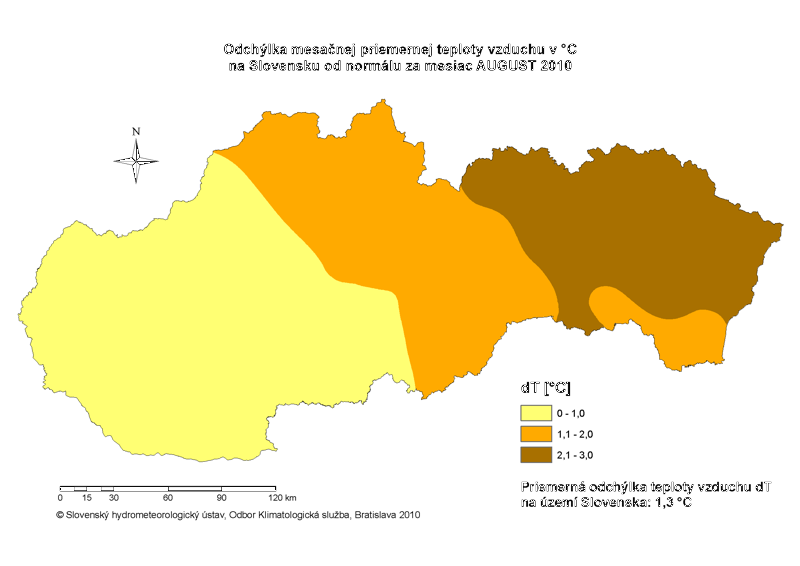 Priestorový rozloženie teplotných odchýlok, ako aj percent normálu atmosférických zrážok na území Slovenska pre všetky letné mesiace (jún-august) a leto 2010 prinášajú mapové spracovania na Obr. 1-6. Teplotná odchýlka najteplejšieho letného mesiaca, júla 2010, sa pohybovala v rozmedzí od +1,7 do +3,8 °C (priemerne +2,9 °C). Medzi najteplejšie sa v júli 2010 zaradili regióny na strednom Slovensku a vo východnej polovici západného Slovenska. Relatívne najchladnejší, ale stále teplotne nadpriemerný skončil august 2010, pričom teplotné odchýlky sa pohybovali v pomerne širokom intervale od 0 do +3,0 °C. Mimoriadne teplo bolo predovšetkým na východnom a severovýchodnom Slovensku.