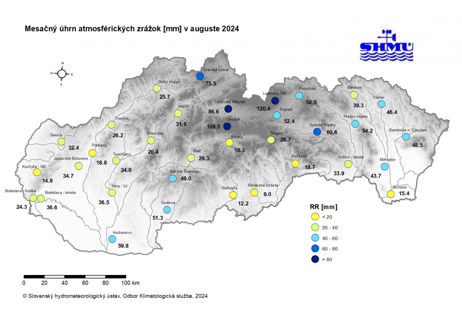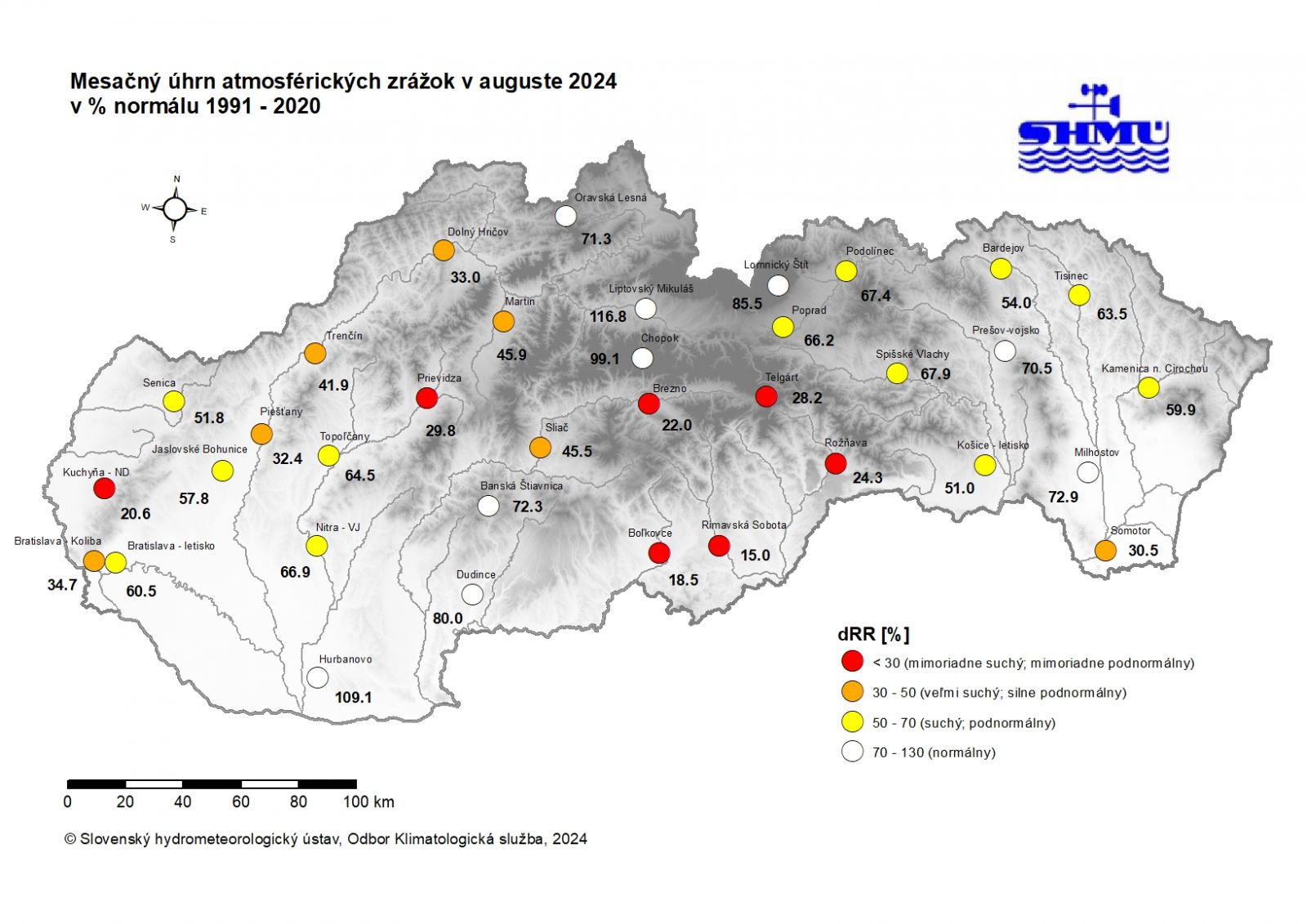 August 2024 bol na väčšine územia Slovenska zrážkovo mimoriadne podnormálny (mimoriadne suchý) až normálny. Percento normálu 1991 - 2020 mesačného úhrnu zrážok bolo najvyššie 116,8 % v Liptovskom Mikuláši a najnižšie 15,0 % v Rimavskej Sobote. Najnižší mesačný úhrn sme namerali na zrážkomernej stanici Rimavská Sobota 9,0 mm. Veľmi nízky úhrn zrážok bol aj na staniciach Zlatníky 9,7 mm, Chvojnica 9,8 mm, Hostice 10,7 mm, Radošina 11,2 mm, Boľkovce 12,2 mm, Bratislava-Mlynská dolina 12,4 mm, Uhrovec 13,2 mm, Ľuboreč 13,9 mm, Kuchyňa 14,8 mm a Lenartovce 14,9 mm.