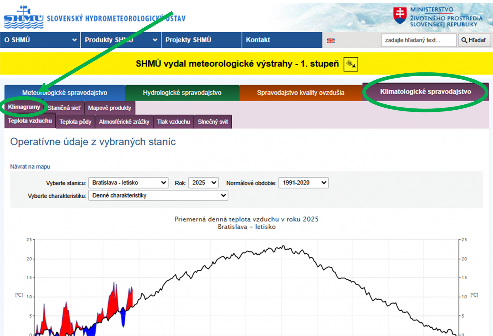 V rámci Klimatologického spravodajstva zostáva aj naďalej v ponuke sekcia Klimagramy (Obr. 3), kde sa pre vybrané klimatologické stanice operatívne vykresľujú aktuálne údaje maximálnej, minimálnej a priemernej teploty vzduchu aj v porovnaní s jedným z normálových období. Na výber sú pritom až tri normálové obdobia, ktoré sa v rámci WMO postupne využívali: 1961 – 1990, 1981 – 2010 a 1991 – 2020. Dostupné sú aj grafy pre mesačné, sezónne a ročné charakteristiky. Okrem teploty vzduchu nájdete v rámci klimagramov aj teplotu pôdy, atmosférické zrážky, tlak vzduchu a slnečný svit.