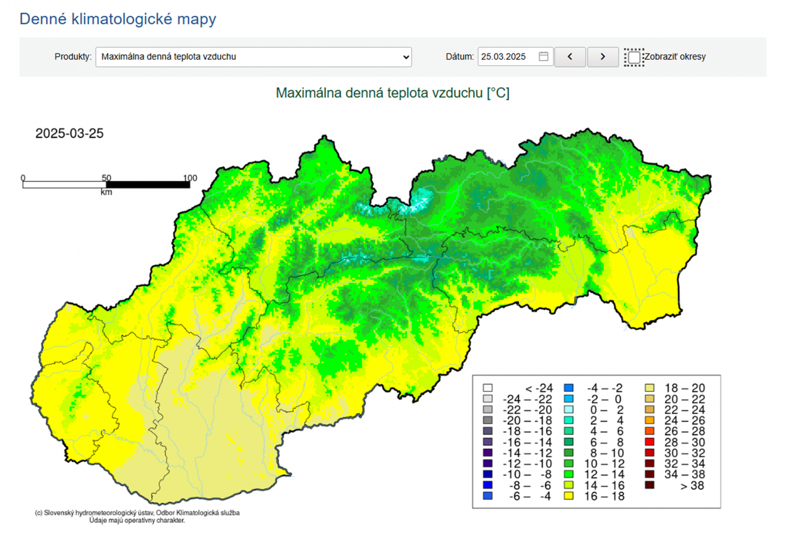 Aktuálne sa už v rámci Klimatologického spravodajstva (Obr. 1) nachádzajú nielen mapy priemernej dennej teploty vzduchu a denného úhrnu zrážok, ale aj mapy maximálnej a minimálnej teploty vzduchu (Obr. 2) a dennej sumy potenciálnej evapotranspirácie. Teplotné mapy sú počítané modernou interpolačnou metódou, ktorá bola využitá švajčiarskou a rakúskou meteorologickou službou pre tvorbu historických aj operatívnych mapových produktov pre územie Švajčiarska a Rakúska (Frei, 2014). Podkladom pre tvorbu máp je sieť automatických meteorologických a zrážkomerných staníc SHMÚ, v prípade teplôt doplnená stanicami Horskej záchrannej služby, s ktorou má SHMÚ spoluprácu. Produkty za daný deň sú napočítané približne o 10. hodine dopoludnia nasledujúceho dňa, avšak používateľ si pomocou ikonky kalendára môže vybrať aj starší ako aktuálny deň analýzy.