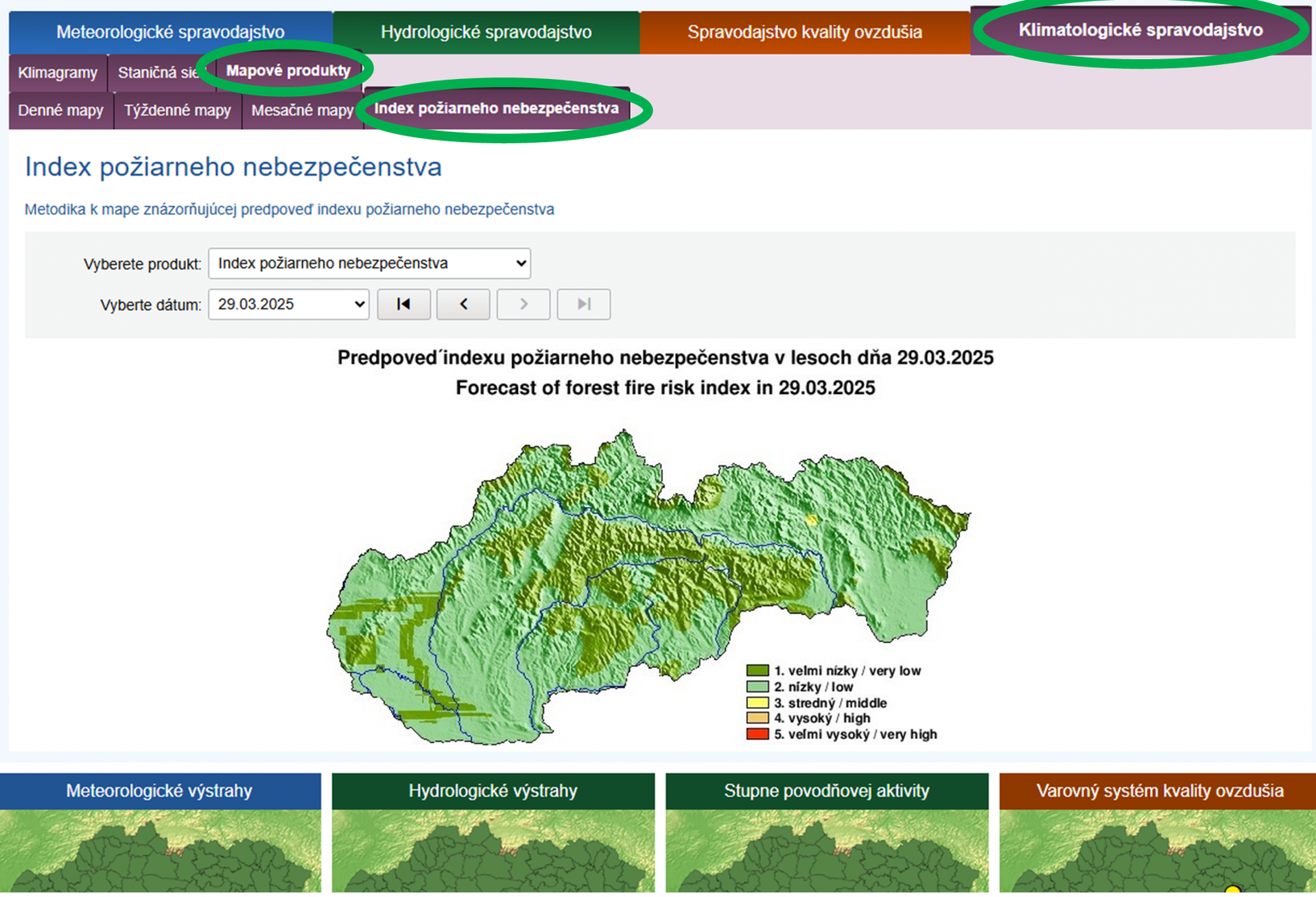Aktuálne sprístupnený balík nových mapových produktov pritom nie je posledným, ktorý môže široká verejnosť očakávať v priebehu tohto roku. V priebehu krátkeho času je plánované zavedenie aktualizovaného mapového monitoringu sucha, ktorý okrem plošného pokrytia prinesie aj ansámblovú predpoveď na 7 dní, ako aj ďalšie novinky. V ďalšej fáze bude zavedený nový modernejší index požiarneho nebezpečenstva, ktorý nateraz zostáva v pôvodnej verzii avšak v samostatnej záložke (Obr. 4). Rovnako v priebehu tohto roka plánujeme zverejniť na web nové bioklimatologické mapové produkty. O všetkých aktualizáciách vás budeme včas informovať.