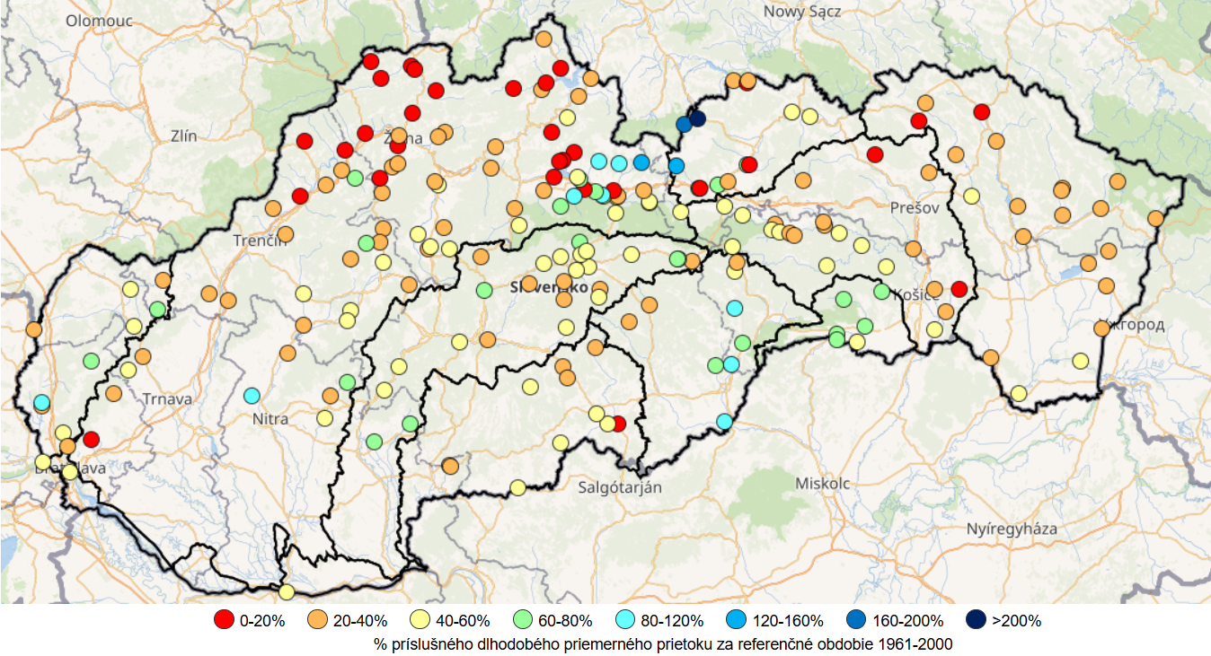 Takmer na celom území Slovenska prevládali hodnoty priemerných mesačných prietokov (Qm) v sledovaných vodomerných staniciach (VS) spadajúce do kategórie suchý mesiac (20 – 40 % Qma,1961-2000). Vo VS v severných častiach Váhu prevládali hodnoty spadajúce až do kategórie extrémne suchý mesiac. V povodí Bodvy prevládali hodnoty spadajúce do kategórie podnormálny mesiac (60 – 80 % Qma,1961-2000). V oblasti Tatier, v horných častiach povodí Váh a Dunajec a Poprad, prevládali vo VS hodnoty spadajúce do kategórií normálny až nadnormálny mesiac (Obr. 1).