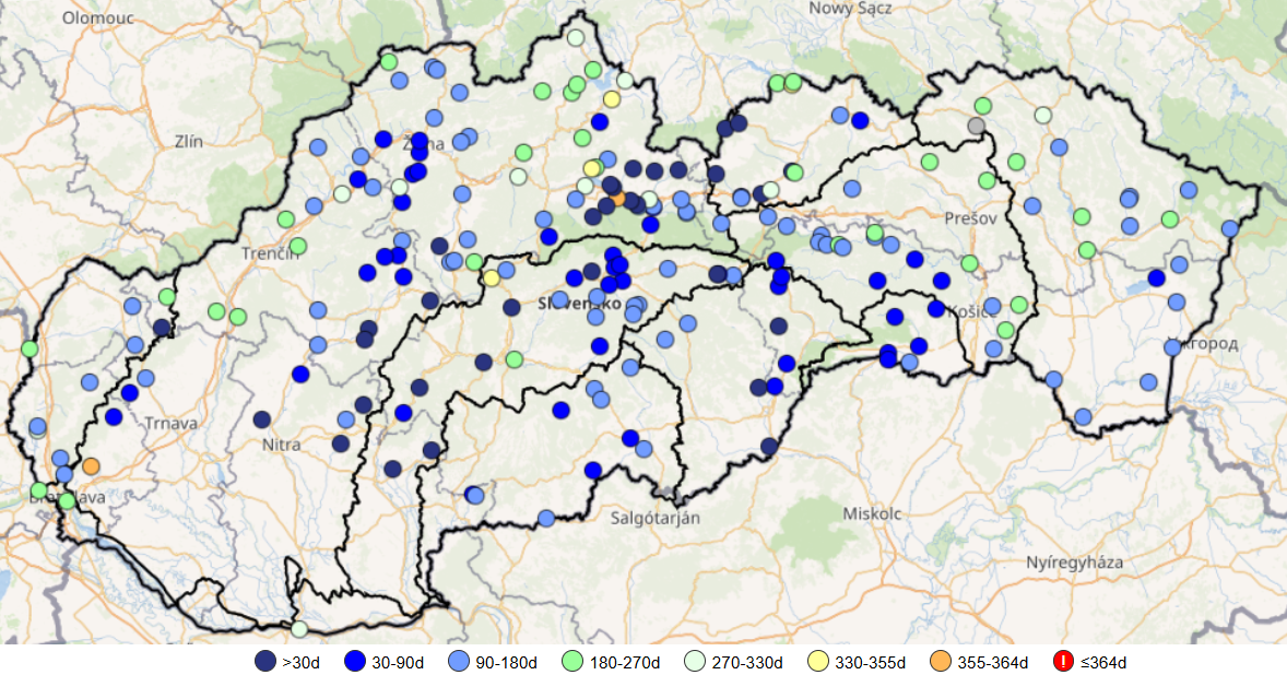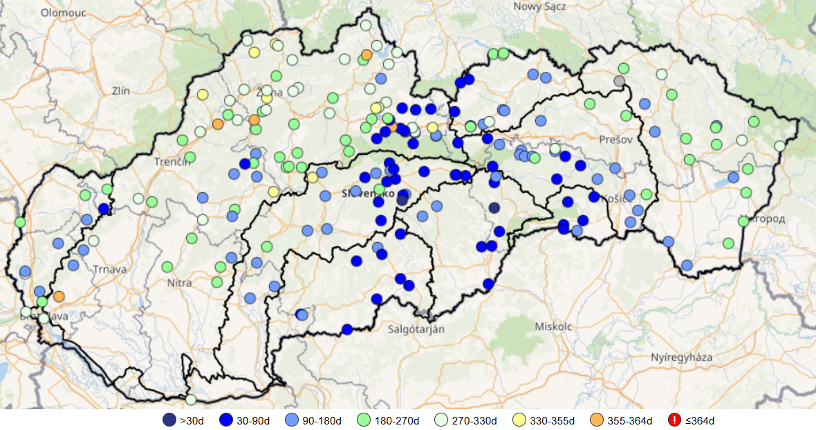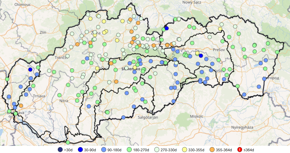 * Poznámka: M-denný prietok predstavuje priemerný denný prietok dosiahnutý alebo prekročený po M dní v zvolenom období. To znamená, že napríklad 355-denný prietok (Q355d) je hodnota, ktorá by v danom profile na toku mala byť menšia v priemere len 10 dní v roku (365 dní mínus 355 dní), po zvyšné dni roka by mala byť buď rovná tejto hodnote alebo väčšia. Za hodnoty blízke minimám (obdobie sucha) považujeme najmä hodnoty odpovedajúce Q355d, Q364d.