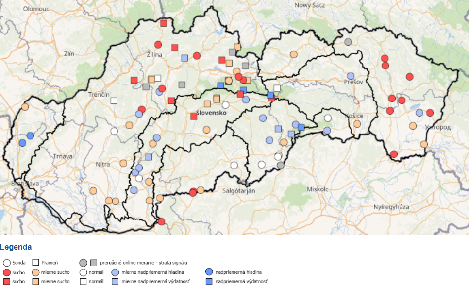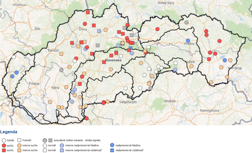 V tretej dekáde mesiaca sme pozorovali mierny nárast hladiny podzemnej vody a výdatnosti prameňov na severe Slovenska, najmä v povodí Dunajca a Popradu (Obr. 9). Oproti začiatku mesiaca sme na konci mesiaca nezaznamenali zmenu skóre sucha u vyše 70 % zo všetkých monitorovaných sond a prameňov.