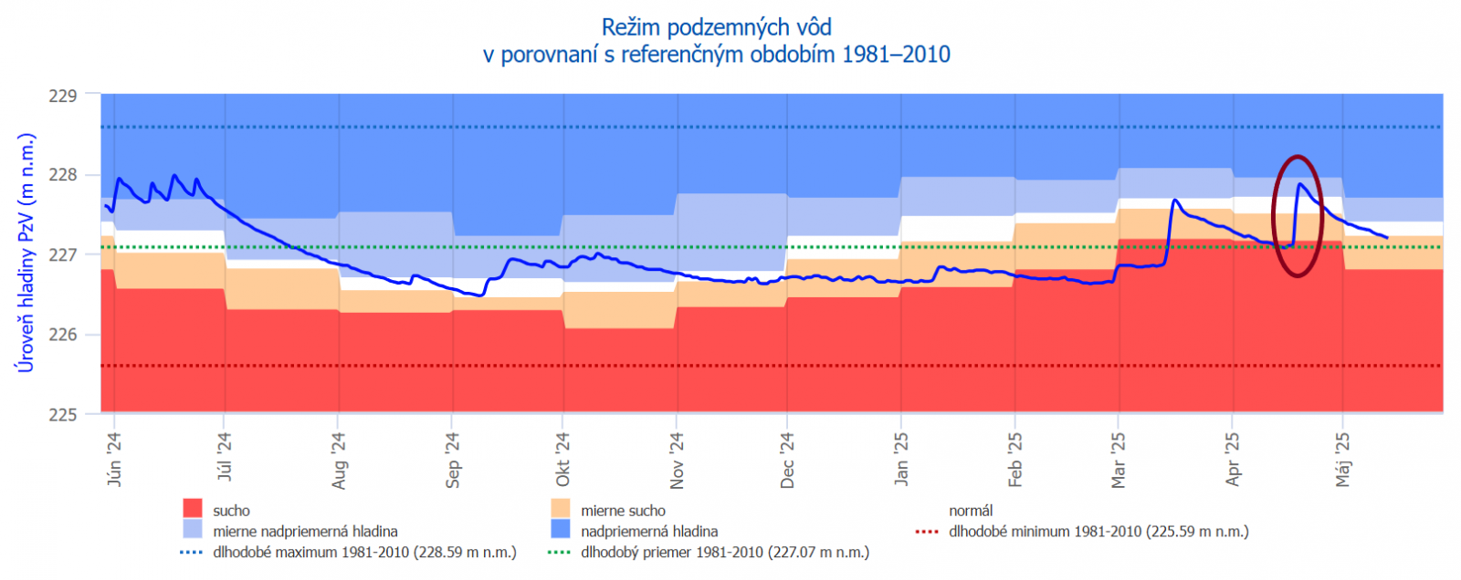 Situácia v podzemnej vode v mesiaci apríl bola na území Slovenska pomerne stabilná s výnimkou povodí Hrona a Slanej, kde vplyvom výskytu významnejších úhrnov zrážok boli pozorované prechodné nárasty hodnôt hladiny podzemnej vody a výdatnosti prameňov. V porovnaní s dlhodobými priemermi takmer polovica (48 %) z celkového počtu monitorovaných objektov dosiahli nadpriemerné hodnoty hladiny a výdatnosti. Nadpriemerný stav hladiny a výdatnosti sa vyskytli v povodí Moravy (hodnoty rovné a vyššie ako Q90 (1981 – 2010)). Naopak, sucho (hodnoty rovné a nižšie ako Q10,40 (1981 – 2010)) bolo zaznamenané v povodiach Bodrogu, Hrona, Ipľa, Váhu a Dunajca a Popradu. Priemerný až mierne podpriemerný stav bol zaznamenaný v povodí Hornádu a Slanej (hodnoty rovné a nižšie ako Q60 (1981 – 2010)). V minulosti patrili jarné mesiace (marec, apríl, máj) k hlavným zdrojom dopĺňania zásob podzemnej vody. Aj mesiac apríl sa vyznačoval nadpriemernými stavmi podzemnej vody v dôsledku jarného topenia snehovej pokrývky, ktorá už niekoľko rokov v zimnom období chýba, prípadne sa vyskytuje iba v najvyšších polohách. Dôkazom toho je aj tohtoročné hodnotenie mesiaca a jeho zaradenia medzi podpriemerné, suché mesiace. Kým v predchádzajúcom roku 2024 sme mesiac apríl hodnotili z pohľadu podzemnej vody ako priemerný, v aktuálnom roku 2025 bol vyhodnotený ako podpriemerný, teda suchý.