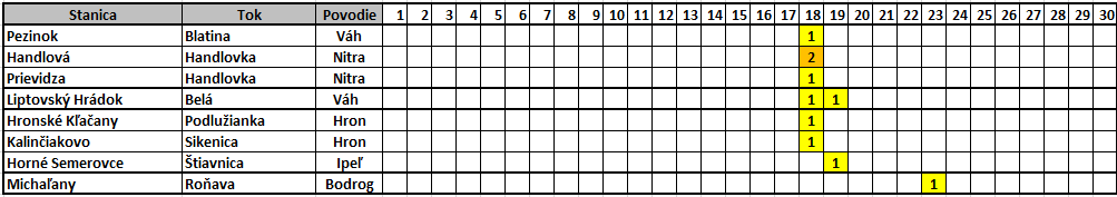 Tab. 1 Zaznamenané SPA na monitorovaných vodomerných staniciach počas apríla 2025