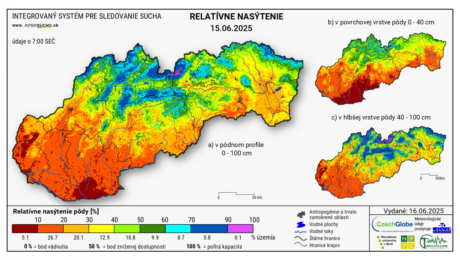 Obrázok 2 Relatívne nasýtenie pôdy na Slovensku dňa 15.6.2025