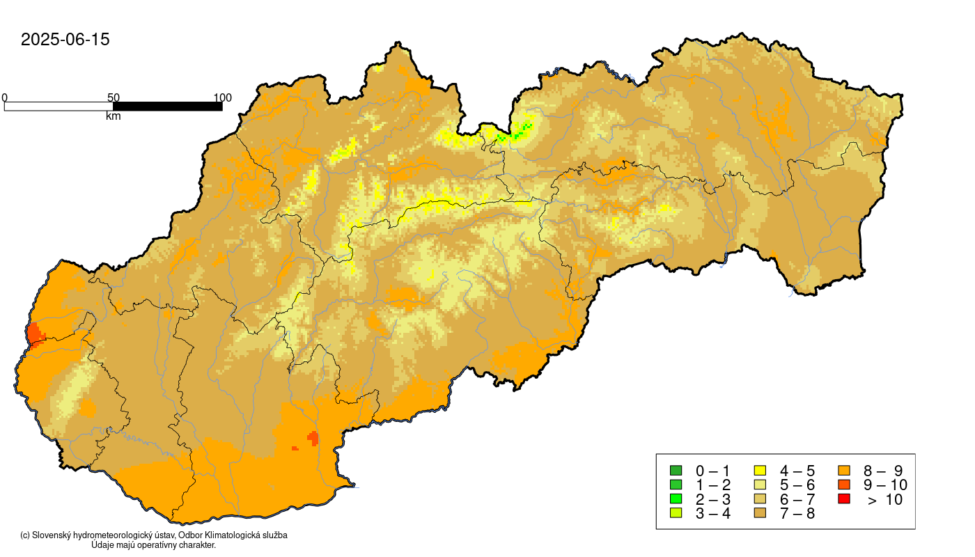 Aktuálny stav pôdneho sucha je výsledkom dlhodobo akumulovaného deficitu zrážok (Obr. 3) v kombinácii s vysokým výparom (Obr. 4) v dôsledku vysokých denných teplôt vzduchu sprevádzaných pomerne nízkou relatívnou vlhkosťou vzduchu. Suma denného výparu 15.6.2025 dosahovala v najteplejších lokalitách Slovenska úroveň 8 – 10 mm, čo výrazne prehlbuje vlahový deficit aj v atmosférickej bilancii.