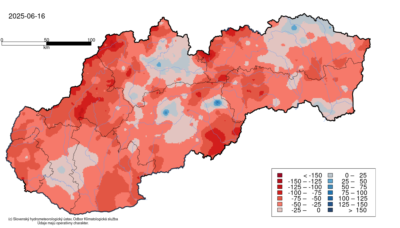 Obrázok 3 Bilancia zrážok v porovnaní s 90-dňovým normálom na Slovensku dňa 16.6.2025