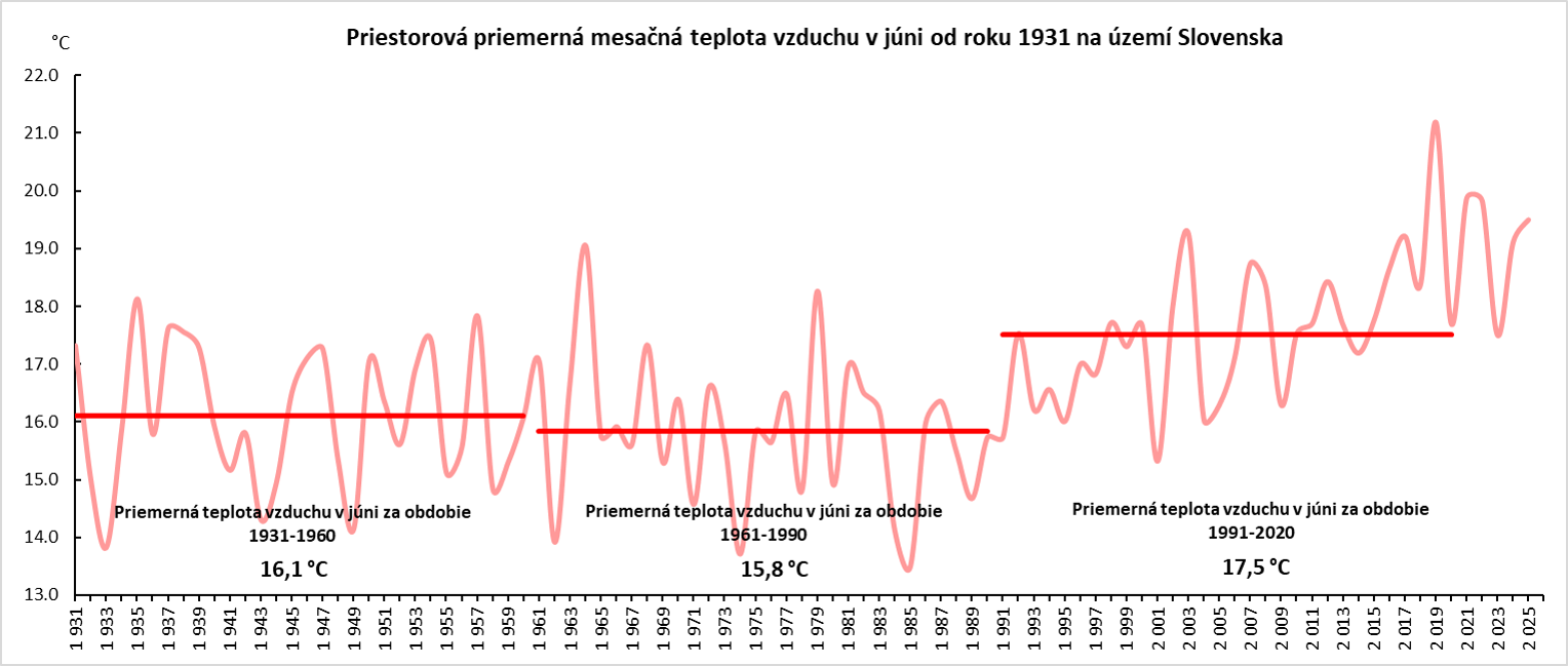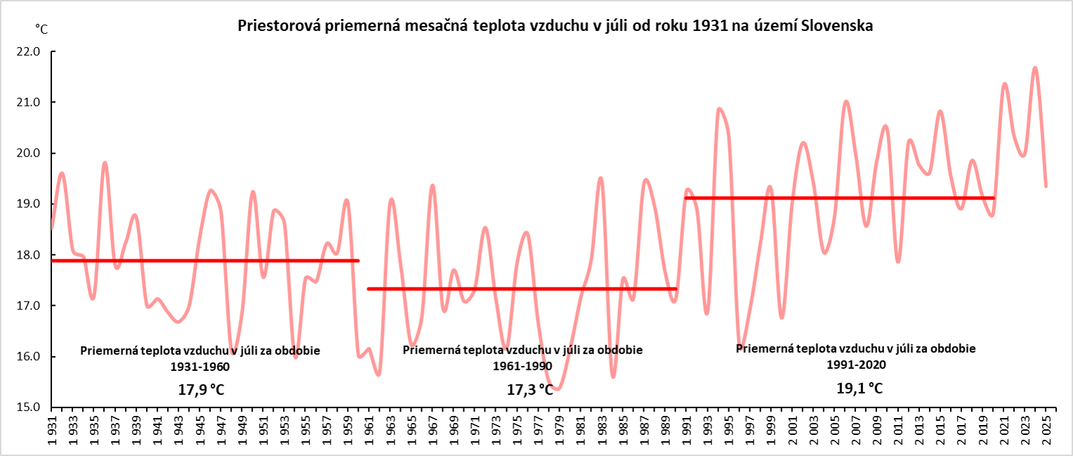 Keď sa pozrieme na priestorovú priemernú mesačnú teplotu vzduchu počítanú pre celé územie Slovenska, zistíme, že mesiac jún 2025 bol o 0,15 °C teplejší ako mesiac júl 2025. Tohtoročný jún sa tak zaradil ako 4. najteplejší jún od roku 1931 na Slovensku s hodnotou 19,5 °C, pričom tohtoročný júl bol až 24. najteplejší od roku 1931 na Slovensku s hodnotou 19,35 °C. V porovnaní s normálovým obdobím 1991-2020 dosiahla priestorová priemerná mesačná teplota vzduchu v júni 2025 kladnú odchýlku, a to 2,0 °C, pričom v mesiaci júl 2025 dosiahla odchýlka od normálu 1991-2020 len 0,24 °C, takže ho považujeme za teplotne normálny. Ak by sme ho porovnali s obdobím, ktoré zažívali naši rodičia, či starí rodičia, bol by júl 2025 považovaný za nadnormálne teplý.
