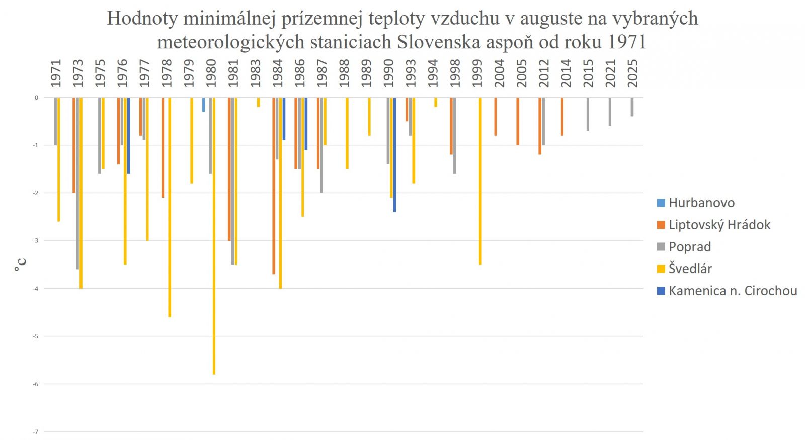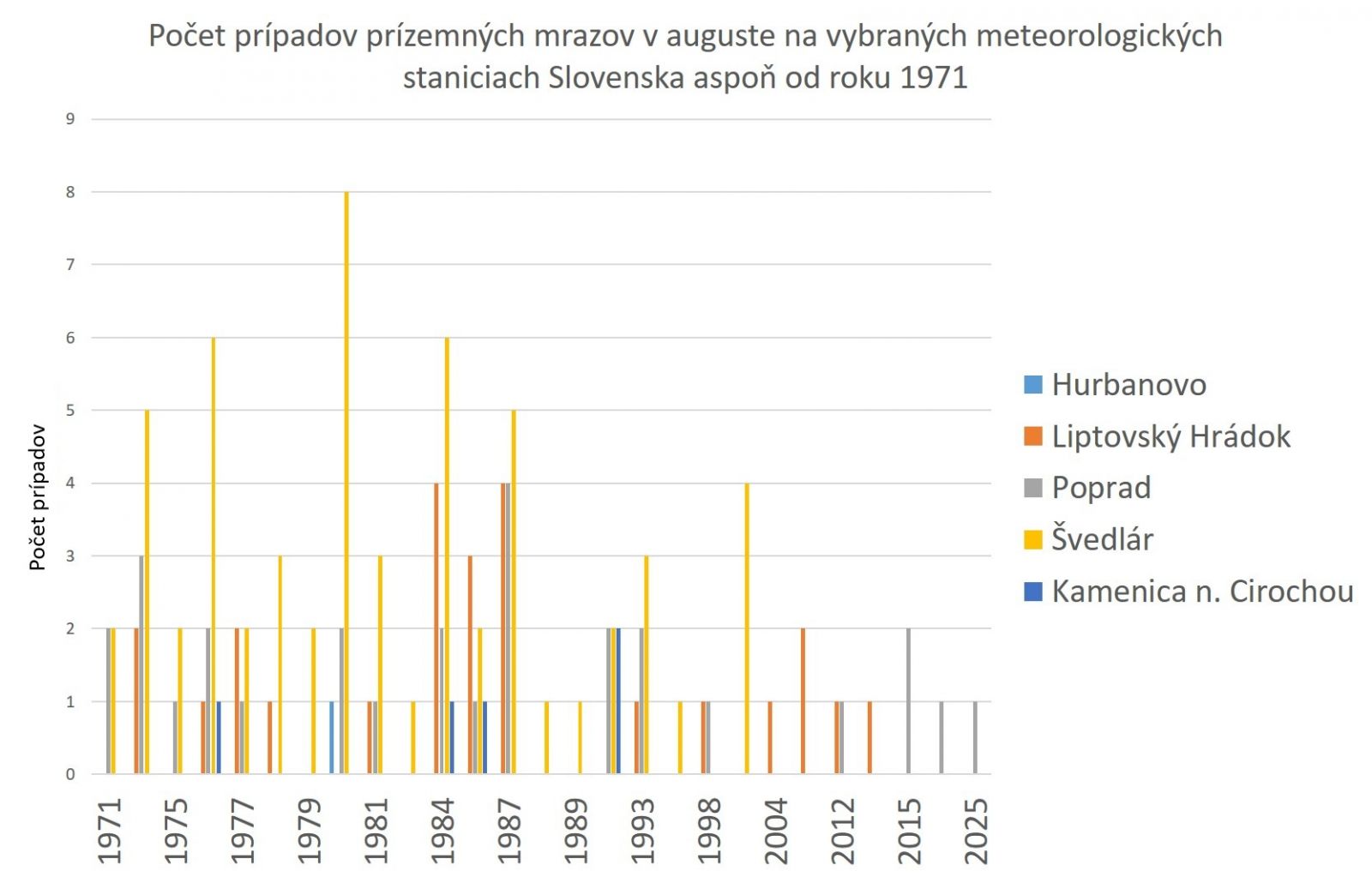 Z výsledkov meteorologických meraní vyplýva že, v krajných prípadoch môže klesnúť minimálna perízemná teplota vzduchu na konci leta na Slovensku až do úrovne okolo -6 °C (Švedlár –5,8°C, 26.8.1980) (Obr.1). Počet prípadov prízemných mrazov v poslednej dekáde augusta je na Slovensku až takmer 10-krát vyšší ako v prvej dekáde augusta. V minulosti sa mohlo vyskytnúť aj niekoľko prízemných mrazov v auguste na jednej meteorologickej stanici, ako napríklad v roku 1980 na meteorologickej stanici Švedlár bolo až 8 takýchto hodnôt v auguste (Obr. 2). Z historického hľadiska je známe, že počet prípadov prízemných mrazov v auguste na Slovensku klesá približne od začiatku poslednej dekády 20. storočia. Prejavuje sa vplyv klimatickej zmeny na charakteristiky teploty vzduchu, kedy ubúda výskyt záporných hodnôt. Práve takéto hodnoty tejto charakteristiky sa vyskytli aj dnes v noci, napríklad na meteorologickej stanici Poprad a to -0,4°C, pričom vo výške 2 m bola minimálna teplota vzduchu na tejto stanici +4,0 °C. Vo výške 2 m nad povrchom bola dnes ráno najnižšia minimálna teplota vzduchu na stanici Vernár 1,7 °C, ďalej Huty 1,8 °C, Stratená-Dobšinská Ľadová Jaskyňa 2,1 °C, Oravská Polhora 2,2 °C, Vyšná Boca 2,3 °C a Liptovská Teplička 2,4 °C. Je možné, že na týchto staniciach sa vyskytol prízemný mráz, aj keď merania prízemnej teploty vzduchu z týchto lokalít nemáme.
