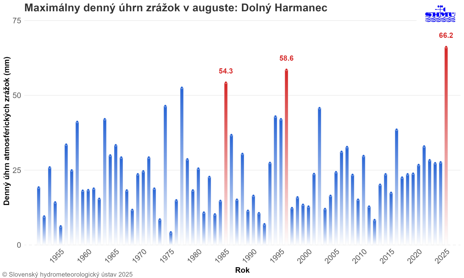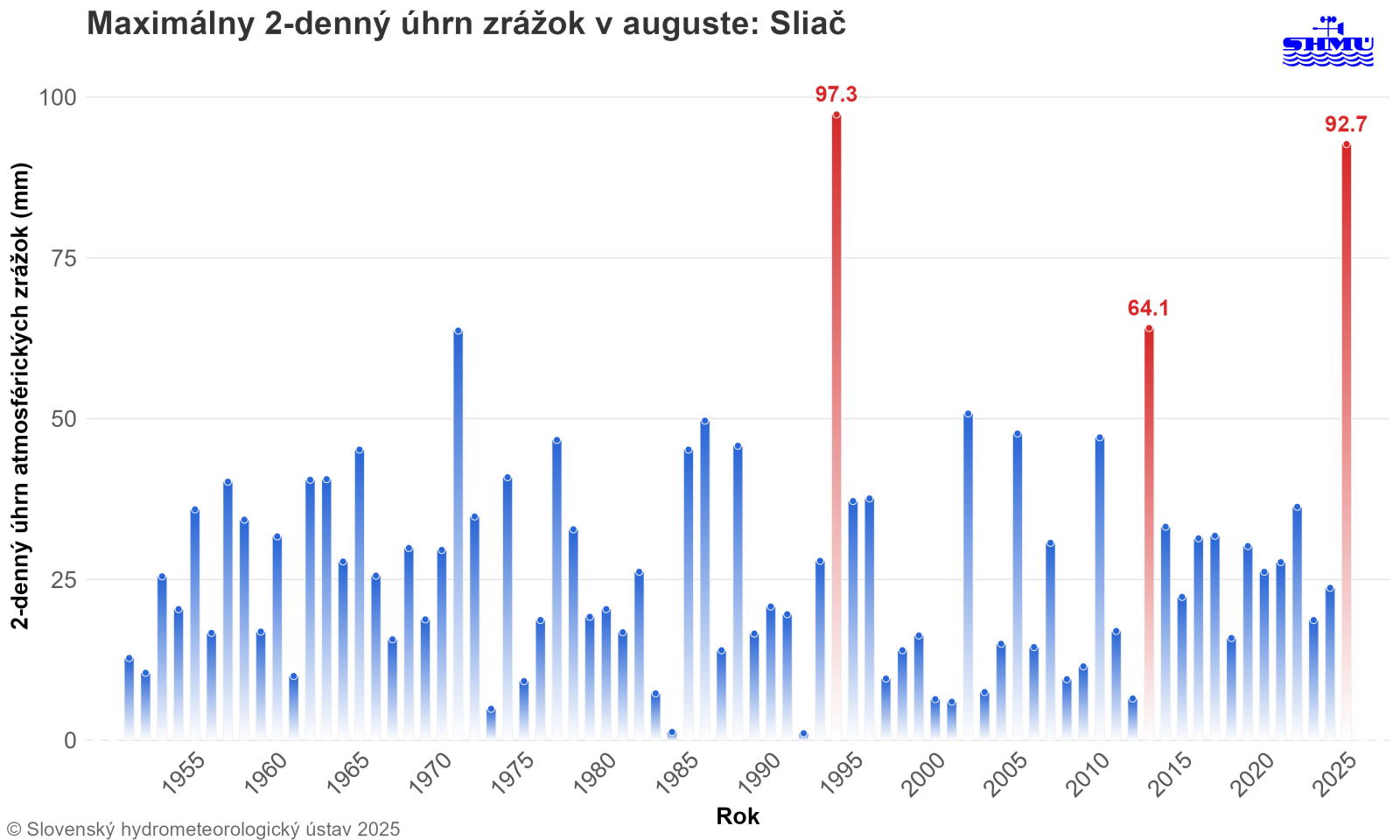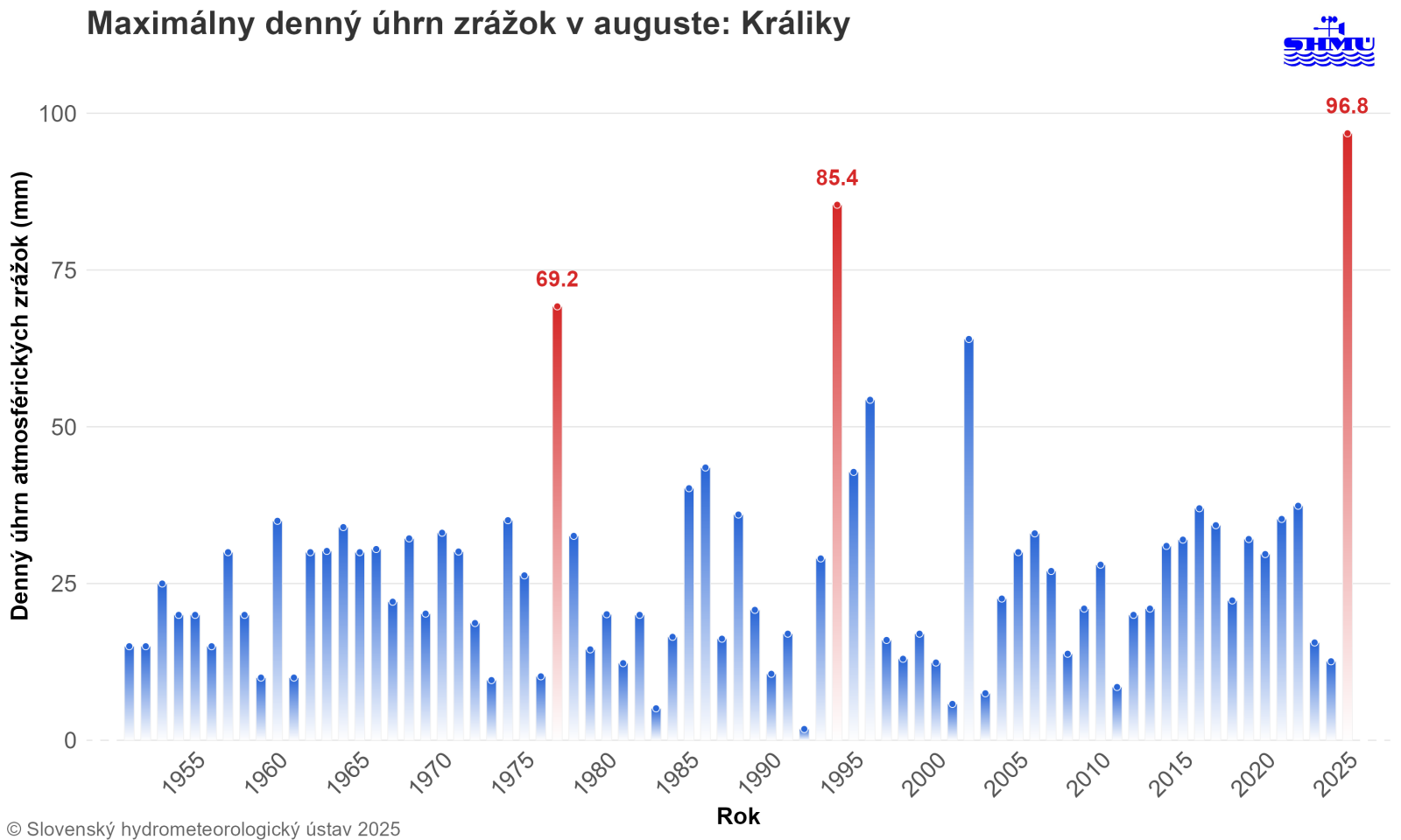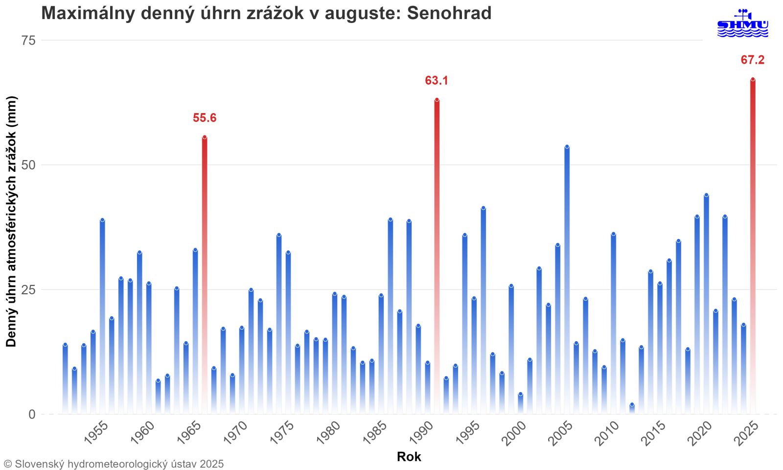 Atmosférické zrážky na konci tohtoročného augusta podporili aj mesačné úhrny, ktoré v zasiahnutých oblastiach dosiahli výraznejšie nadnormálne hodnoty. Rekordné denné úhrny zrážok pre mesiac august aspoň od roku 1951 sme zaregistrovali: