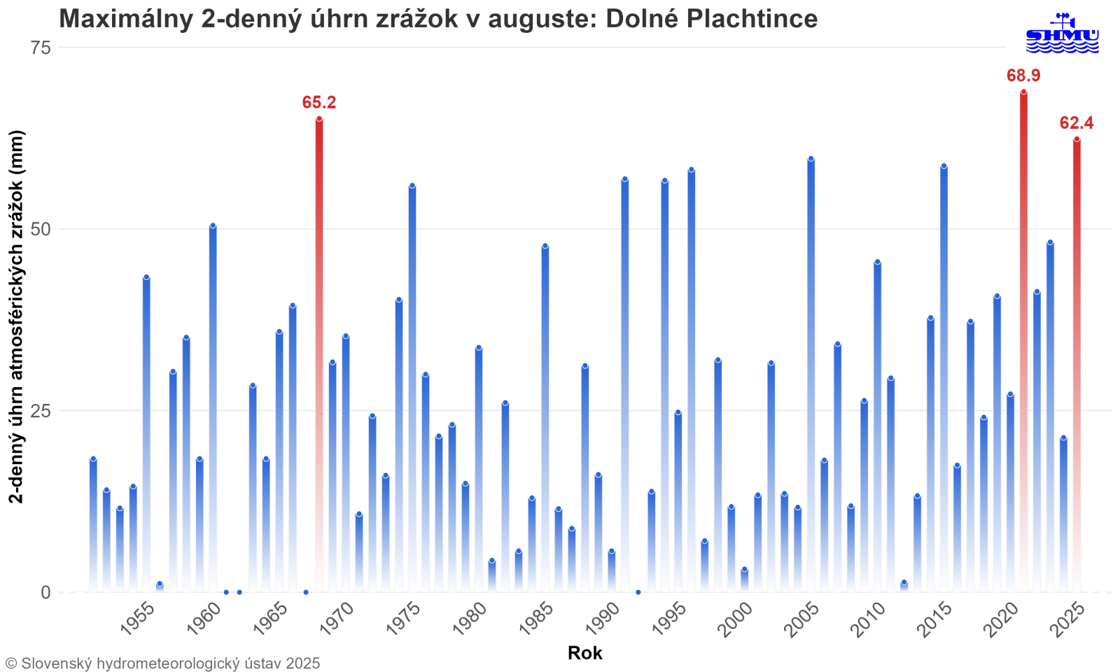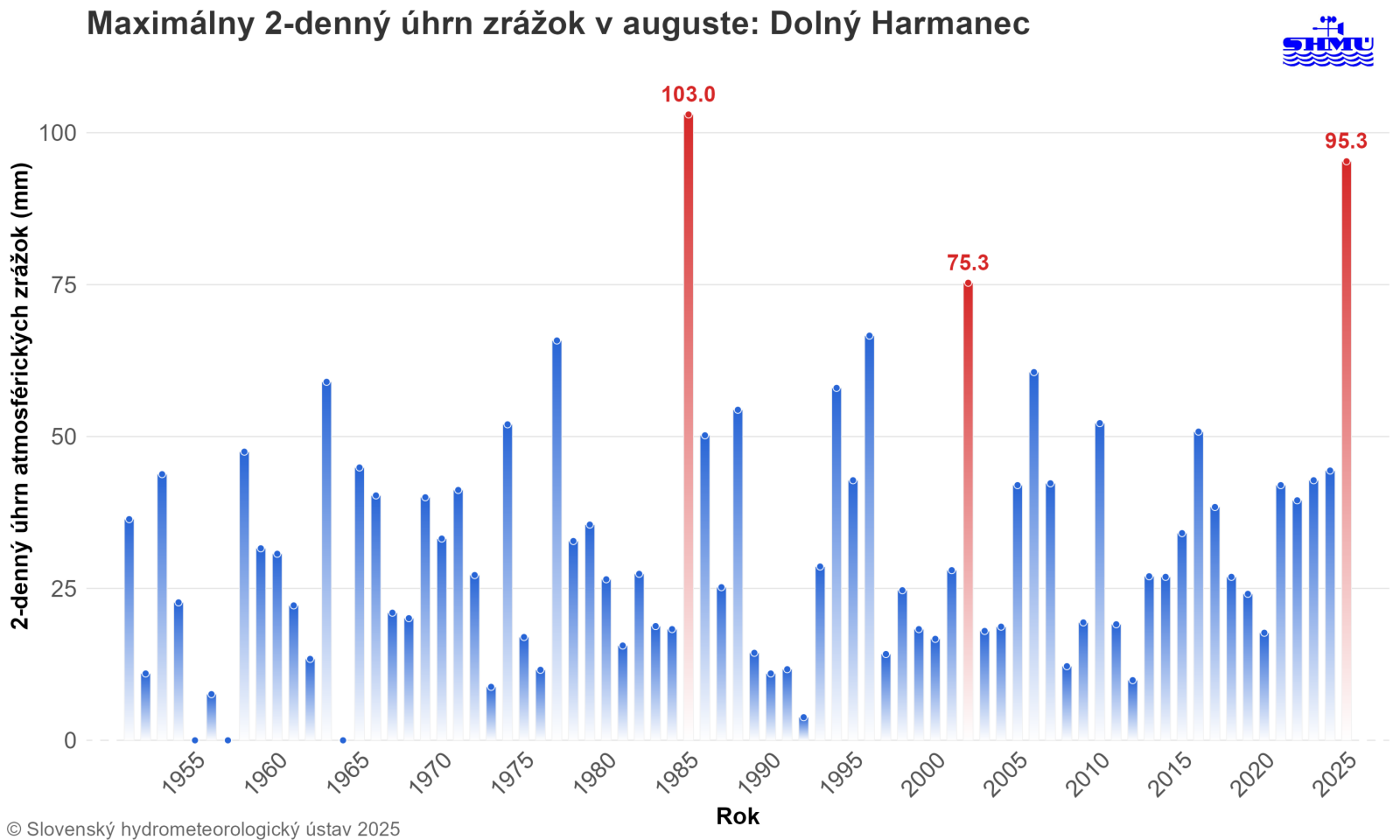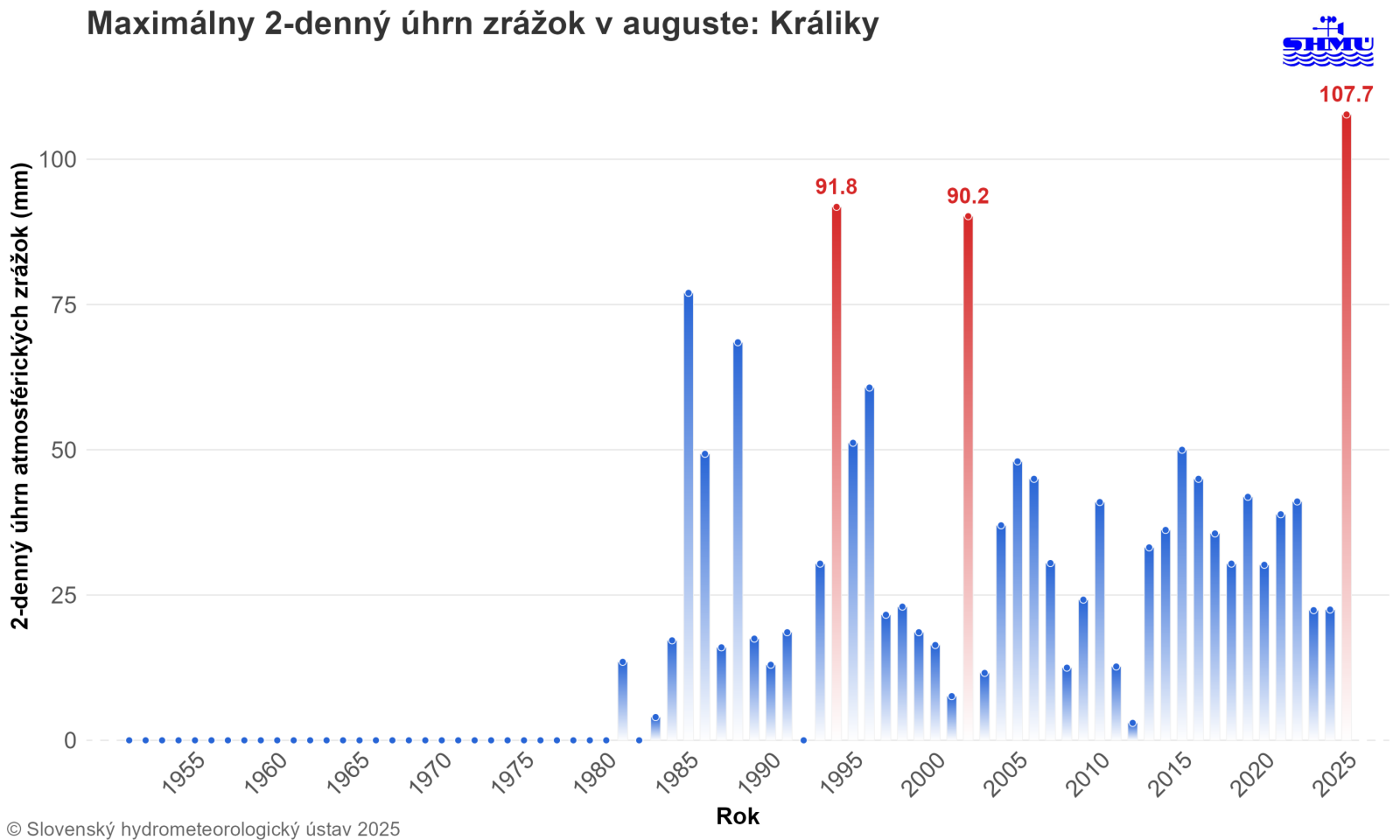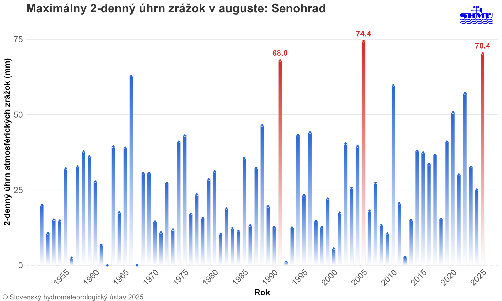 Atmosférické zrážky na konci tohtoročného augusta podporili aj mesačné úhrny, ktoré v zasiahnutých oblastiach dosiahli výraznejšie nadnormálne hodnoty. Rekordné denné úhrny zrážok pre mesiac august aspoň od roku 1951 sme zaregistrovali: