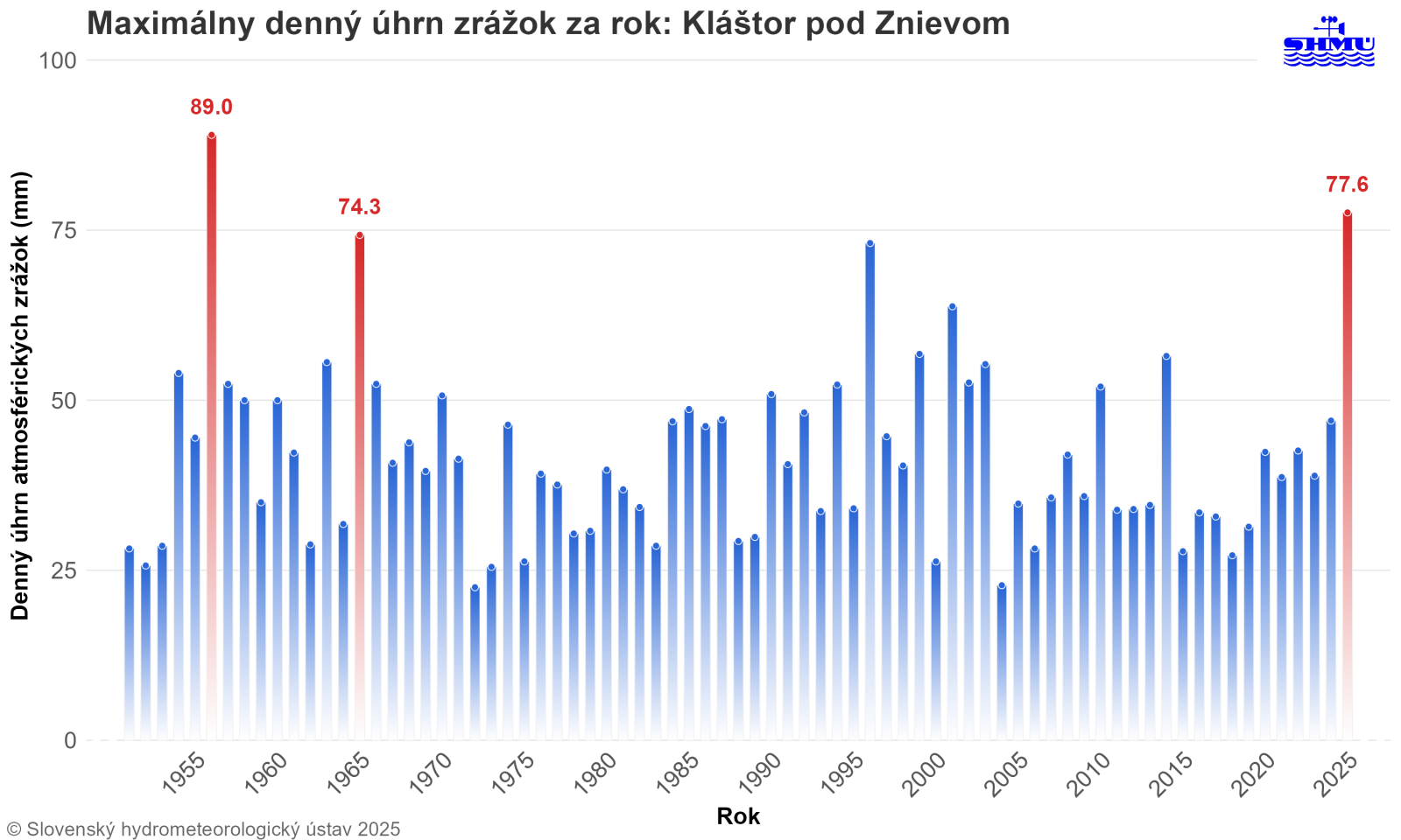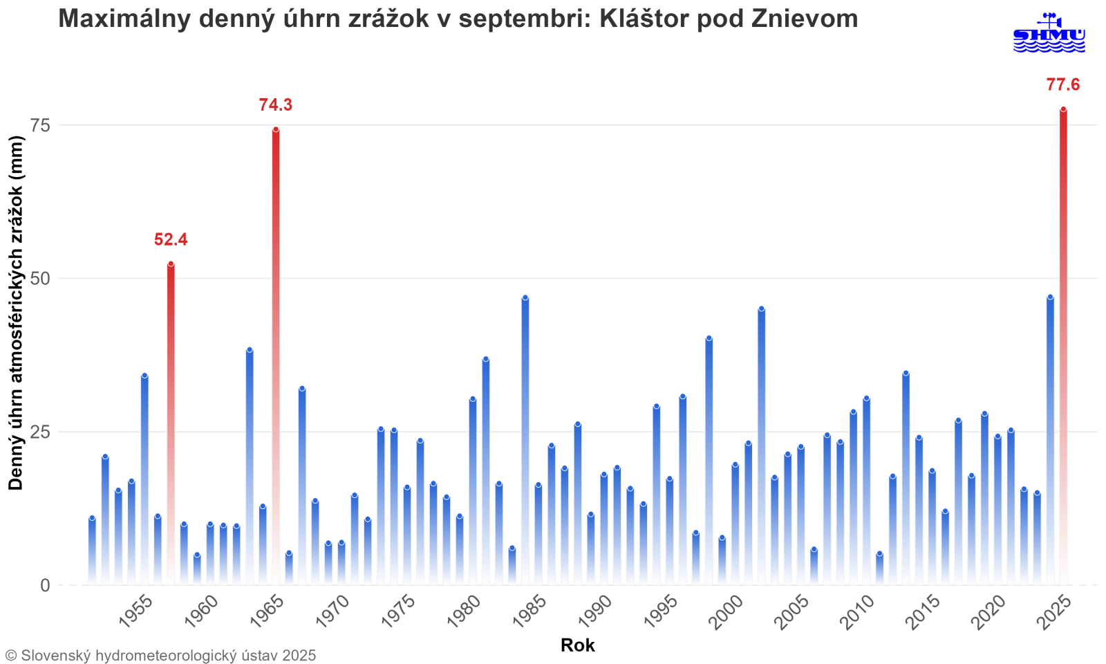V septembri to boli najvyššie denné úhrny zrážok aspoň od roku 1951, pričom v Kláštore pod Znievom to bol druhý najvyšší denný úhrn zrážok aspoň za posledných 75 rokov, bez ohľadu na mesiac. Vyšší denný úhrn zrážok tam od roku 1951 zaznamenali iba 20.7.1956 (89,0 mm).