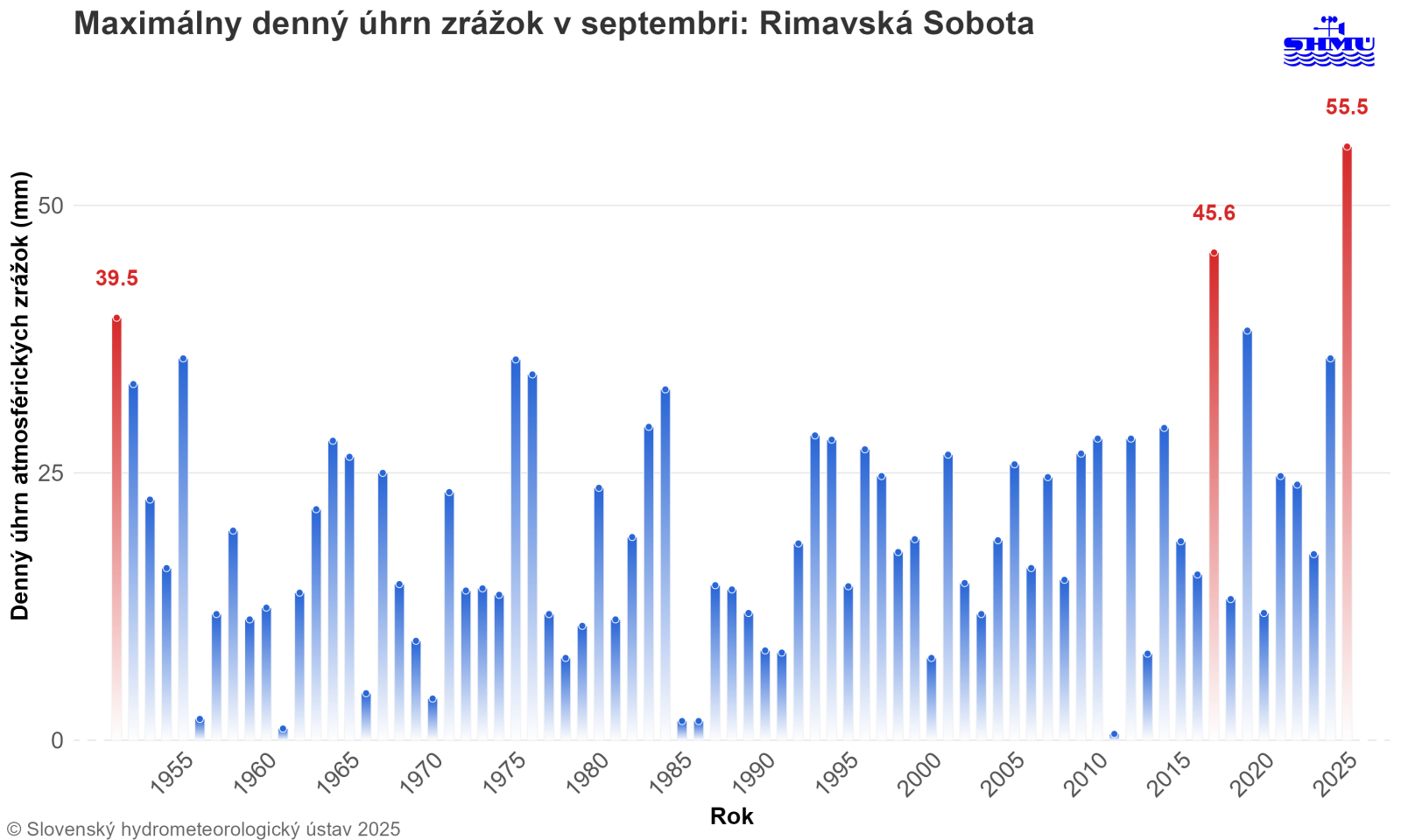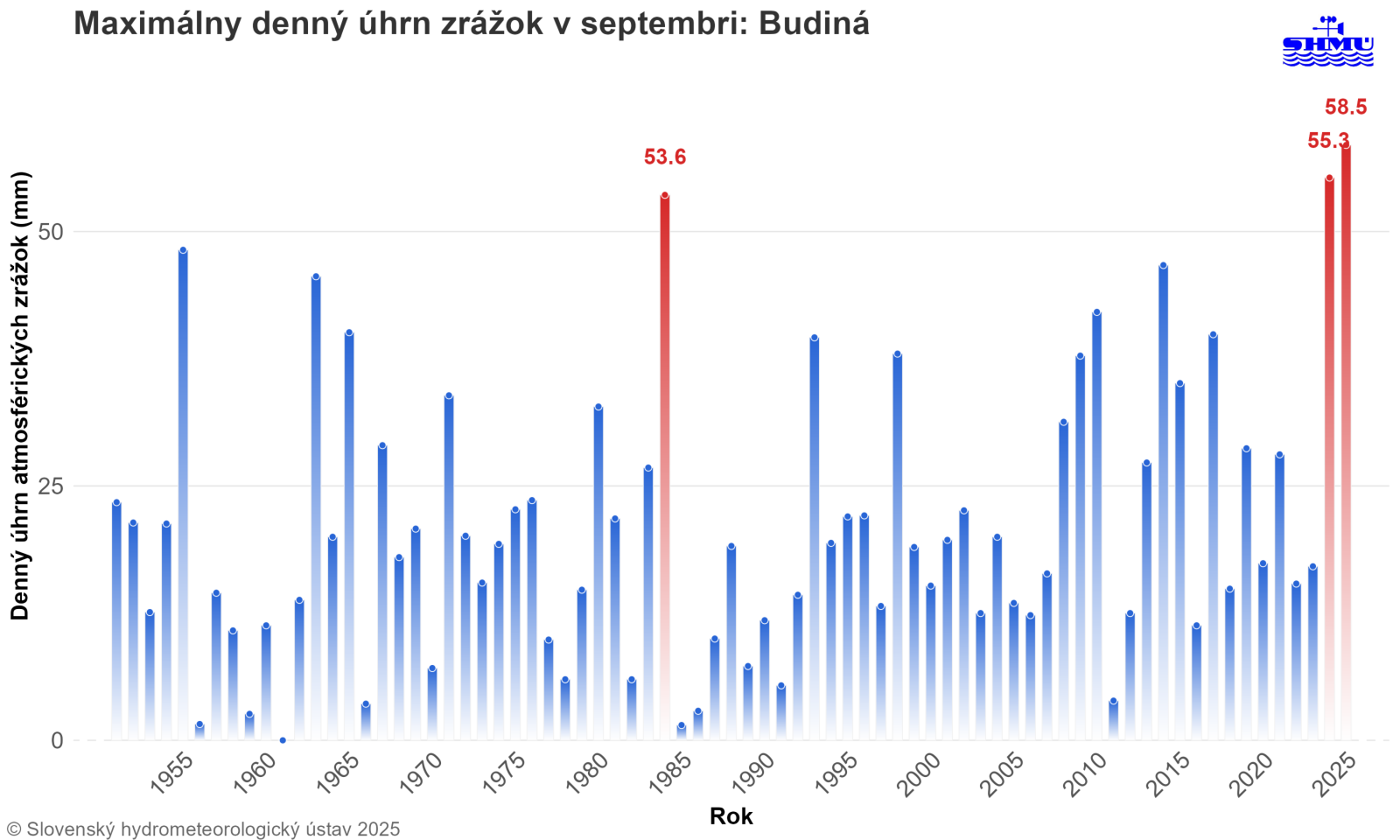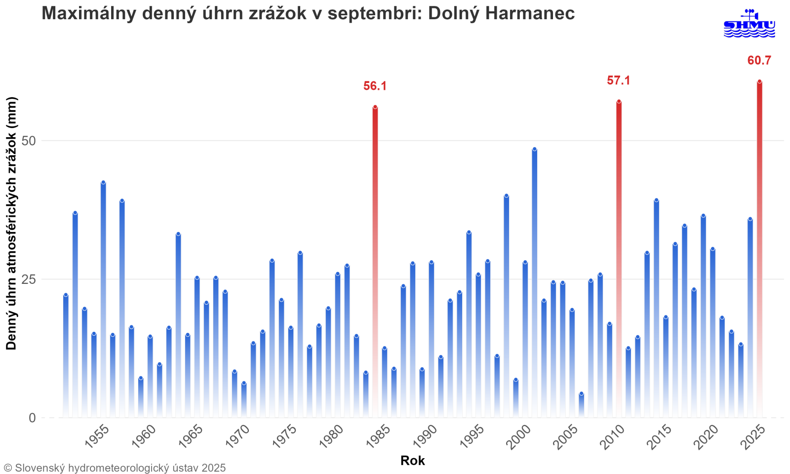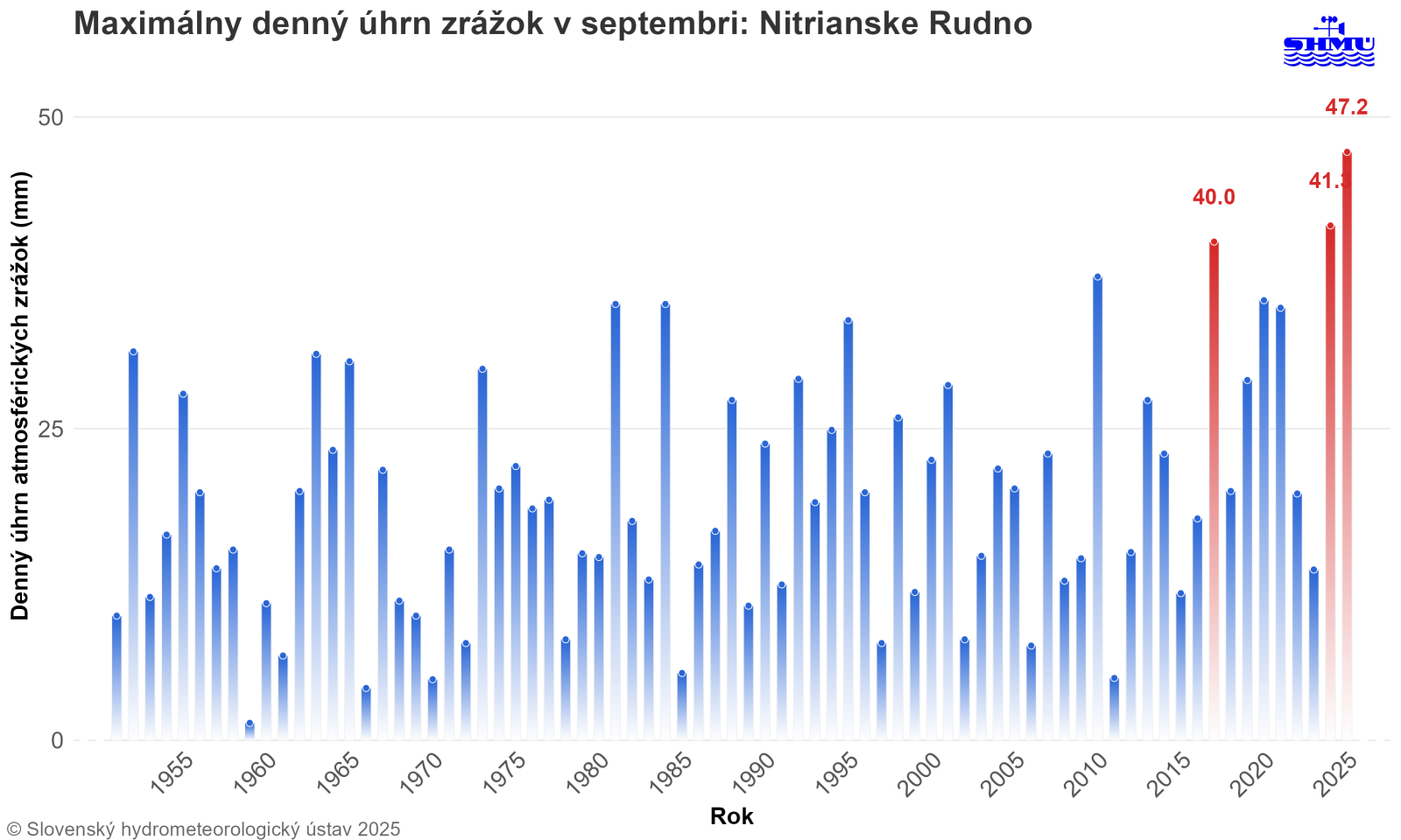 V stredu (10.9.2025) večer a v noci a ráno vo štvrtok (11.9.2025) dosiahli denné úhrny zrážok pri trvalom daždi na niekoľkých meteorologických staniciach Slovenska hodnoty 50 mm a viac napríklad Jasná pod Chopkom 86,9 mm