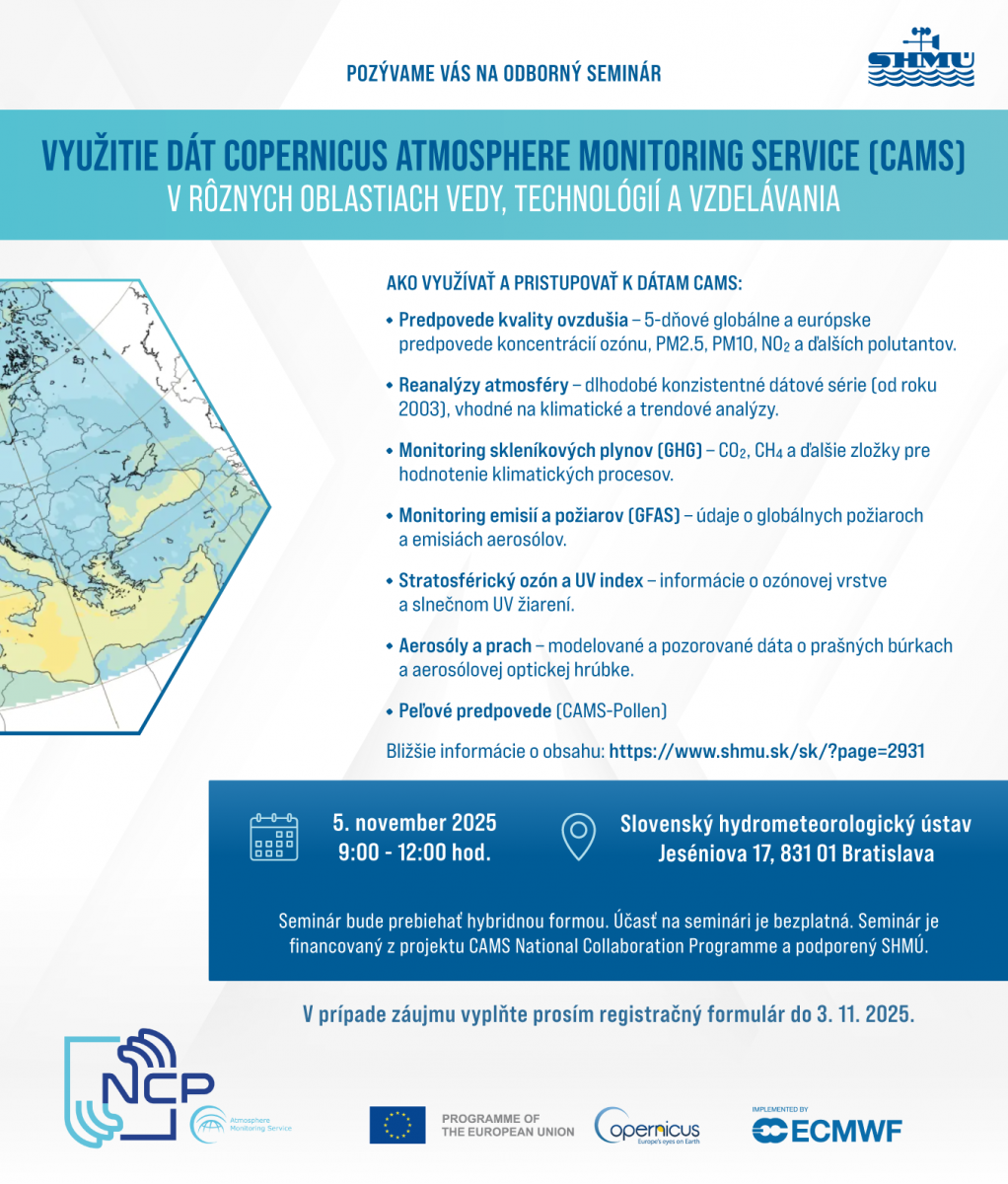 Seminár sa bude konať 5. novembra 2025 (v stredu) o 9.00 hod. v Slovenskom hydrometeorologickom ústave (SHMÚ), Jeséniova 17 v Bratislave. Seminár bude prebiehať hybridnou formou. Účasť na seminári je bezplatná. Seminár je financovaný z projektu CAMS National Collaboration Programme a podporený SHMÚ.