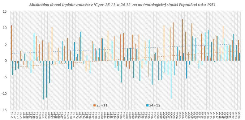 Obr. 2 Maximálna denná teplota vzduchu v °C pre 25.11. a 24.12. na meteorologickej stanici Poprad od roku 1951
