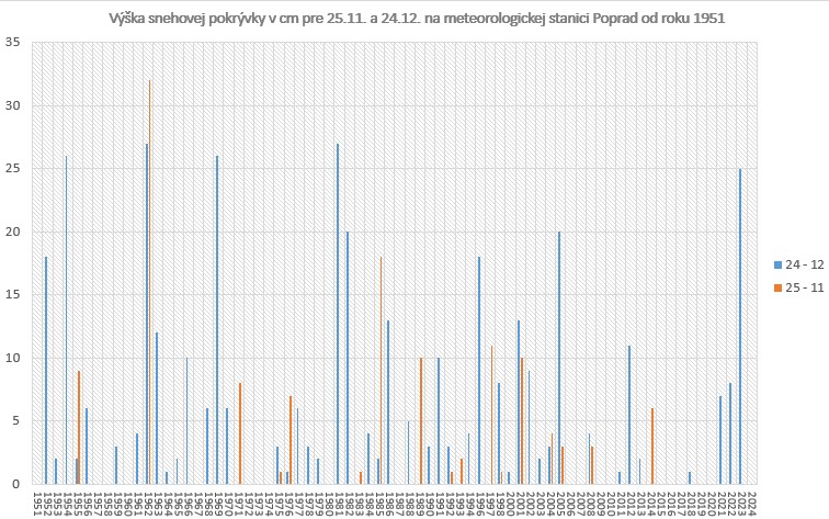 Obr. 3 Výška snehovej pokrývky v cm pre 25.11. a 24.12. na meteorologickej stanici Poprad od roku 1951