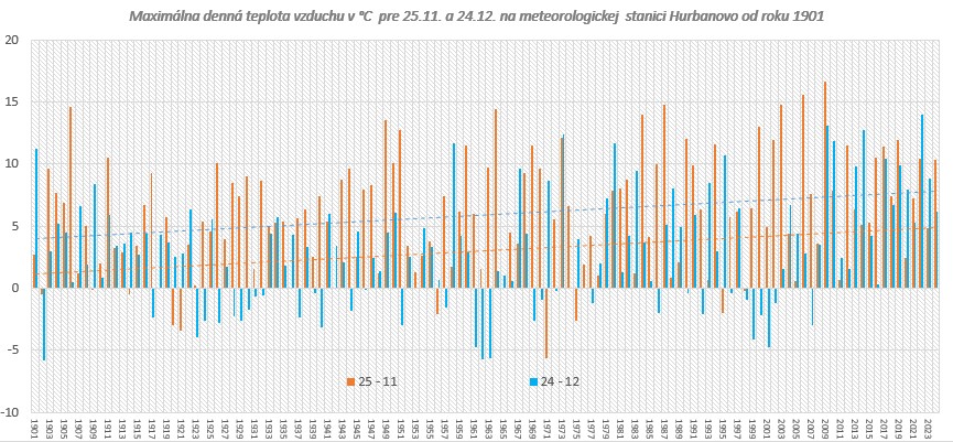 Obr. 1 Maximálna denná teplota vzduchu v °C pre 25.11. a 24.12. na meteorologickej stanici Hurbanovo od roku 1901